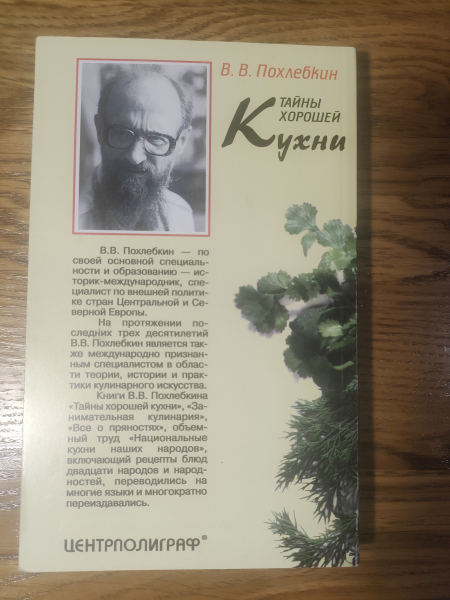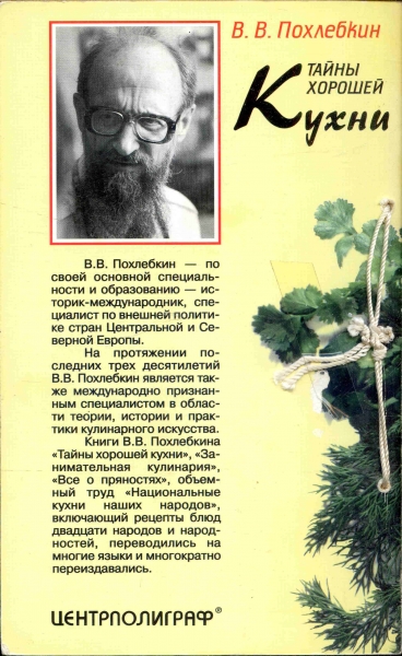 Вильям (Вильям-Август) Васильевич Похлебкин (20 августа 1923, Москва — 22 марта или 30 марта или ок. 31 марта 2000, Подольск, Московская область) — советский и российский историк-скандинавист, геральдист, географ, журналист, действительный член Всесоюзного географического общества, кандидат исторических наук. Специалист по истории международных отношений и кулинарии, крупнейший знаток русской кулинарии. Наибольшую известность — благодаря своим научным работам по кулинарии — Похлебкин приобрел, как исследователь и популяризатор кулинарии, занимаясь гастрономической историей, семиотикой кухни и кулинарной антропологией. В частности реконструировал древнерусское кушанье кундюмы (кундюбки) и ассортимент блюд и напитков в русской классической драматургии конца XVIII—начала XX века. Предложил также разнообразить пищевой рацион космонавтов и ввести для них купаж черного и зеленого чая. Монография Похлебкина «История водки» была удостоена премии Ланге Черетто, присуждаемой интернациональным жюри кулинаров Англии, Франции, Германии и Италии. Почти все его кулинарные книги неоднократно переиздавались по просьбам читателей, общий тираж во всем мире приближается к 100 миллионов экземпляров. Как знаток кулинарии и специалист по скандинавским странам, владевший иностранными языками, принимал участие в создании Книги о вкусной и здоровой пище. Еда по Похлебкину — не проблема желудка, «а проблема сердца…, проблема восстановления национальной души». Например, по его мнению, существуют блюда, не исчезавшие из русской кухни более тысячелетия, такие, как щи с черным хлебом. Похлебкин упомянул «неистребимый ничем аромат щей, щаной дух, который всегда стоял в русской избе». Сравнивая русскую кухню с французской, упомянул не имеющие, по его мнению, аналога во Франции квашеную капусту, соленые огурцы, сухие белые грибы, сметану и хрен. Прижизненное издание. Тираж 100 000 экз. Вес без упаковки 210 г.