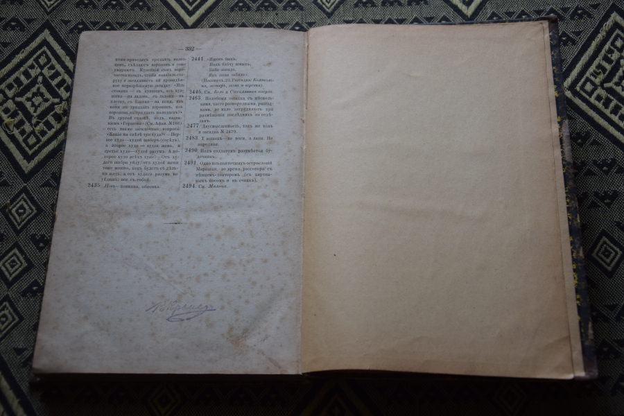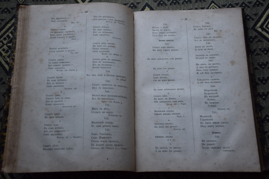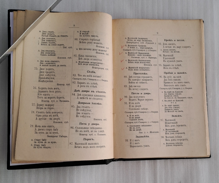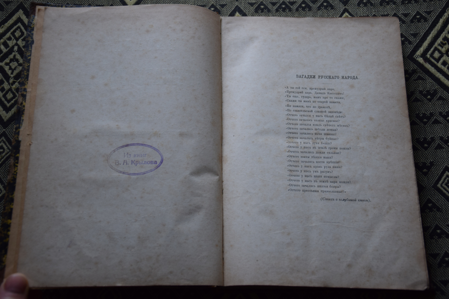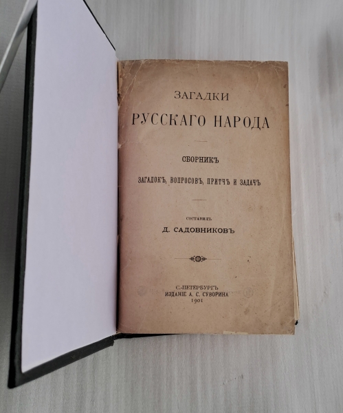 | 3 | BS-eperon Москва. СПб. Издание А.С.Суворина 1901г. 296 с. Твердый переплет, обычный формат. Состояние: хорошее, на первых страницах галочками отмечены некоторые загадки, издательская обложка не сохранилась, переплет позднего времени, следы антикражной полоски на нахзаце Переплет – Корешок – Титульный лист – Разворот |