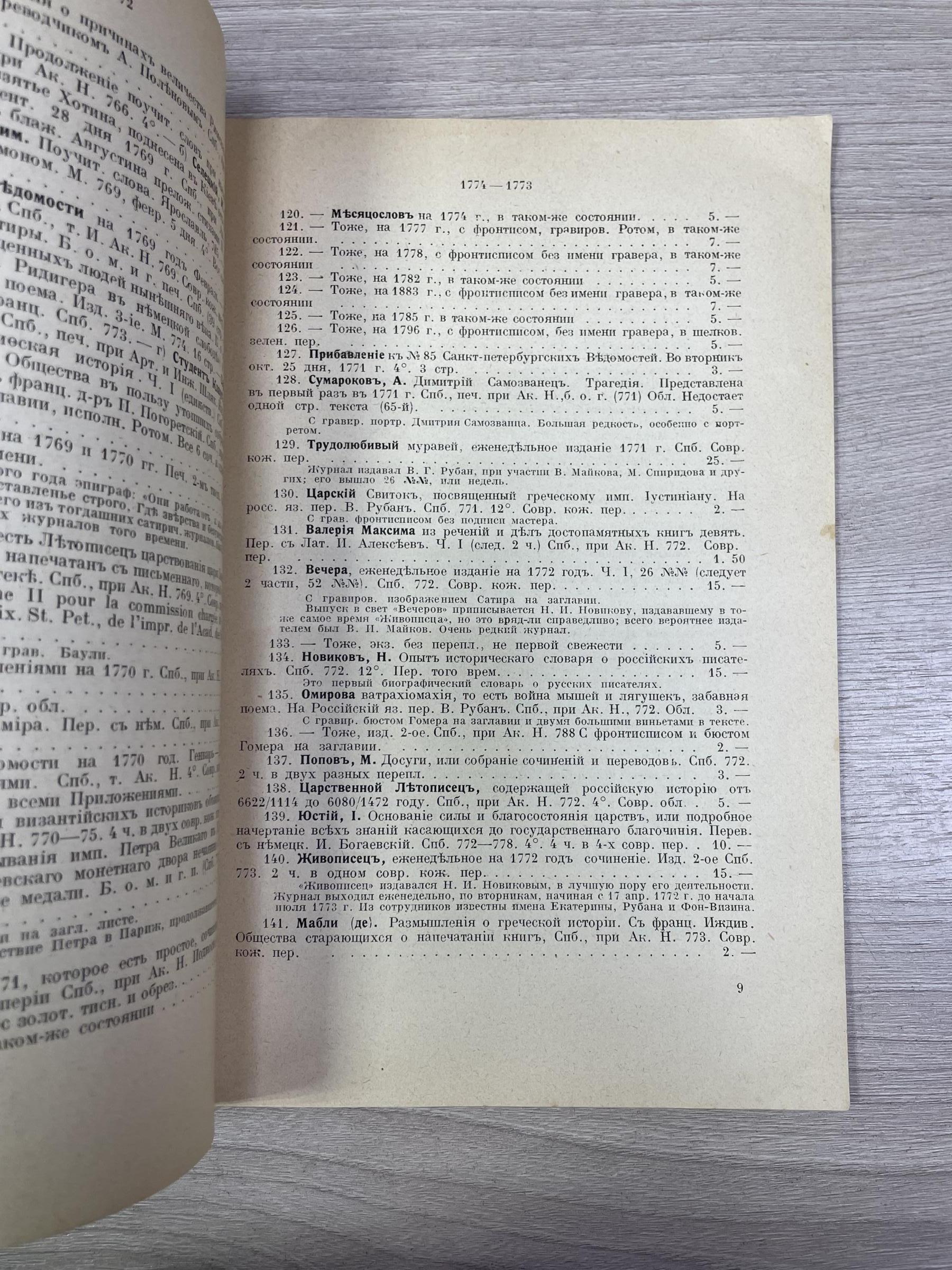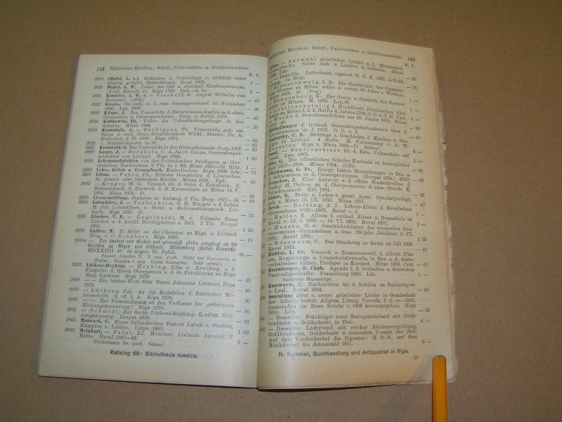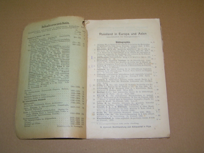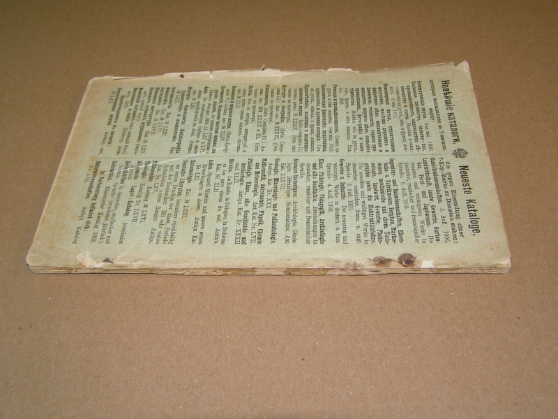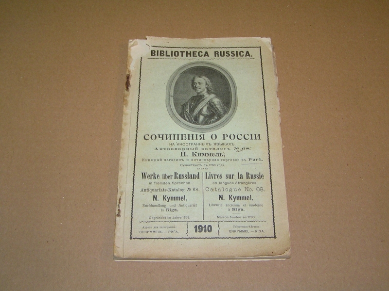 Редкое издание, практически не встречающееся на букинистическом рынке (менее редки каталоги №№ 33 (Отдел I. Богословие и философия) и 39 ( Отдел IV. Словесность)). По записи букинистического магазина на задней обложке данный экземпляр в 1979 году стоил 80 руб. В провинции дело с каталогами развито было слабо. Исключение представлял Н.Г. Киммель в Риге, у которого дело было поставлено на чисто европейский, а именно немецкий образец. Его каталоги, полные, содержательные, разбитые на дробные научные отделы, чрезвычайно интересны. Через Н.Г. Киммеля прошли остатки смирдинской библиотеки, купленной им в 1887 г., составившие ряд специальных каталогов, расположенных но плану Смирдина. Любопытно отметить, что эти `остатки`, доставшиеся Киммелю спустя более полустолетия, как закончилось существование фирмы Смирдина, превосходили своею численностью то, что было в его основных каталогах. Постановка антикварного дела у Н.Г. Киммеля такова, что оно исключительно было рассчитано на экспорт. Книги хранились не в магазине, а в складочном помещении, и были недоступны любителям для обозрения. Приходящим в его магазин предлагались каталоги, по которым только и можно было испросить желаемую книгу. Александр Филиппович Смирдин (21 января (1 февраля) 1795, Москва, Российская империя — 16 (28) сентября 1857, Санкт-Петербург, Российская империя) — русский книгопродавец и издатель. Главная заслуга Смирдина заключается в удешевлении книг, в достойной оценке литературных произведений как капитала и в укреплении прочной связи между литературой и книготорговлей. Его деятельность сыграла значительную роль в истории русского просвещения. Личная библиотека Смирдина составляла 12 036 названий в 50 000 томах. После его смерти была выкуплена и частично распродана, в 20-х гг. XX века оставшаяся часть была продана Министерству иностранных дел Чехии и сейчас хранится в Праге в Национальной библиотеке Чешской Республики. Похоронен на Волковском православном кладбище. Могила утрачена. `КИММЕЛЬ` - старейшая книготорговая фирма, основанная в Риге в 1763 г. и занимавшаяся экспортом книг. Первоначально торговля велась книгами на европейских языках, русский отдел появился позднее. В 1858 г. Николай Люциан Киммель (1816 - 1905) выпустил первый каталог фирмы, что было объявлено в журнале `Библиографические записки` (№ 9 за 1858). Основное место в каталоге занимали антикварные и букинистические книги на европейских и русском языках, поэтому его считают первым каталогом букинистической книги, вышедшим в России. С 1858 по 1913 гг. фирмой было выпущено 76 каталогов. В отделе редких книг РГБ хранится семь каталогов `К.` (из коллекции Н.П. Смирнова-Сокольского): шесть из них посвящены библиотеке А. Смирдина (`Антикварный каталог №№ 33, 34, 36, 39, 40, 44, заключающий в себе перечень книг из библиотеки А. Смирдина, составляющий ныне собственность Н. Киммеля`, в. 1 - 6, 1887 - 90). Последнее упоминание фирмы `К.` относится к 1929 г.