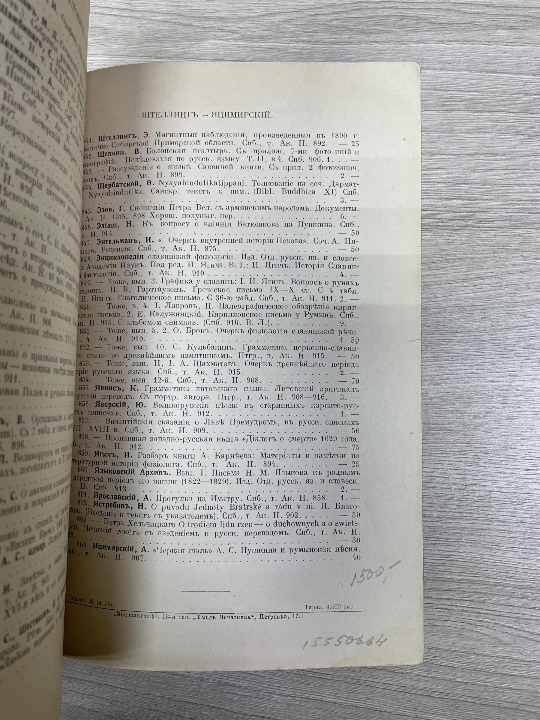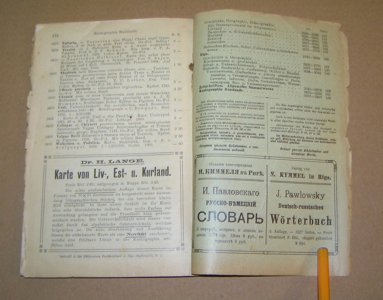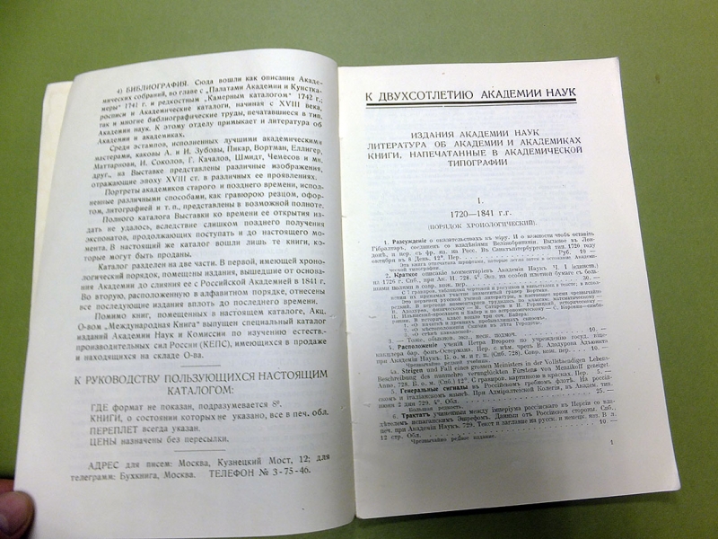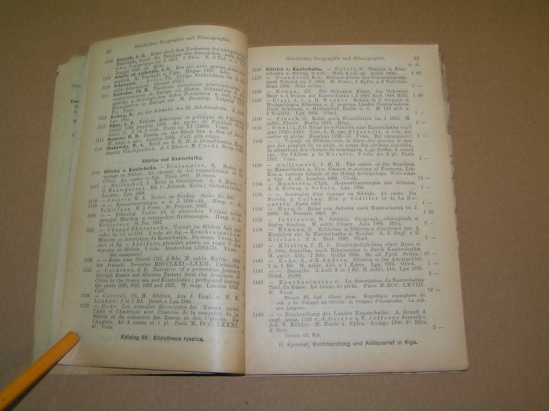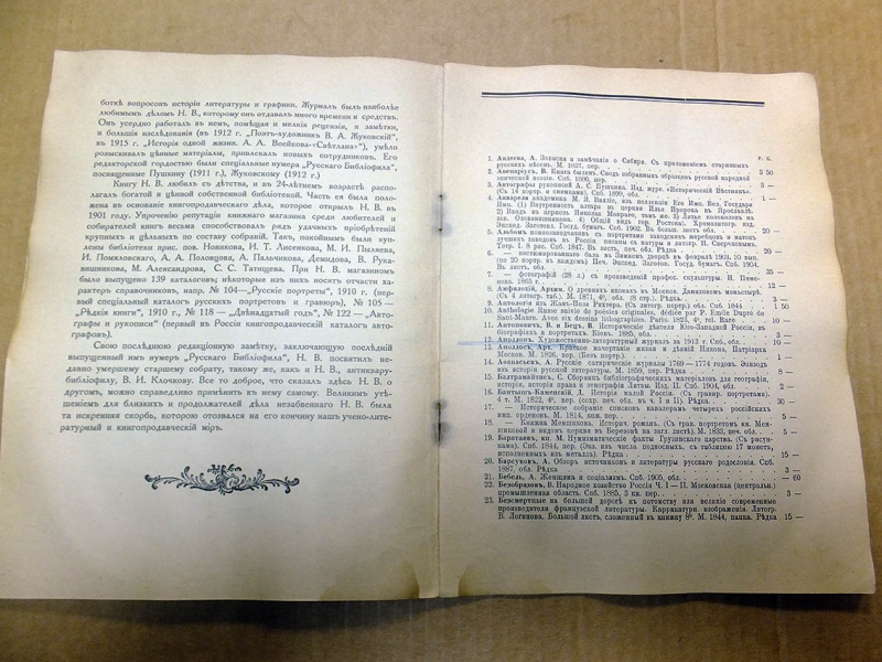 Редкое издание, практически не встречающееся на букинистическом рынке (менее редки каталоги №№ 33 (Отдел I. Богословие и философия) и 39 ( Отдел IV. Словесность)). По записи букинистического магазина на задней обложке данный экземпляр в 1979 году стоил 80 руб. В провинции дело с каталогами развито было слабо. Исключение представлял Н.Г. Киммель в Риге, у которого дело было поставлено на чисто европейский, а именно немецкий образец. Его каталоги, полные, содержательные, разбитые на дробные научные отделы, чрезвычайно интересны. Через Н.Г. Киммеля прошли остатки смирдинской библиотеки, купленной им в 1887 г., составившие ряд специальных каталогов, расположенных но плану Смирдина. Любопытно отметить, что эти `остатки`, доставшиеся Киммелю спустя более полустолетия, как закончилось существование фирмы Смирдина, превосходили своею численностью то, что было в его основных каталогах. Постановка антикварного дела у Н.Г. Киммеля такова, что оно исключительно было рассчитано на экспорт. Книги хранились не в магазине, а в складочном помещении, и были недоступны любителям для обозрения. Приходящим в его магазин предлагались каталоги, по которым только и можно было испросить желаемую книгу. Александр Филиппович Смирдин (21 января (1 февраля) 1795, Москва, Российская империя — 16 (28) сентября 1857, Санкт-Петербург, Российская империя) — русский книгопродавец и издатель. Главная заслуга Смирдина заключается в удешевлении книг, в достойной оценке литературных произведений как капитала и в укреплении прочной связи между литературой и книготорговлей. Его деятельность сыграла значительную роль в истории русского просвещения. Личная библиотека Смирдина составляла 12 036 названий в 50 000 томах. После его смерти была выкуплена и частично распродана, в 20-х гг. XX века оставшаяся часть была продана Министерству иностранных дел Чехии и сейчас хранится в Праге в Национальной библиотеке Чешской Республики. Похоронен на Волковском православном кладбище. Могила утрачена. `КИММЕЛЬ` - старейшая книготорговая фирма, основанная в Риге в 1763 г. и занимавшаяся экспортом книг. Первоначально торговля велась книгами на европейских языках, русский отдел появился позднее. В 1858 г. Николай Люциан Киммель (1816 - 1905) выпустил первый каталог фирмы, что было объявлено в журнале `Библиографические записки` (№ 9 за 1858). Основное место в каталоге занимали антикварные и букинистические книги на европейских и русском языках, поэтому его считают первым каталогом букинистической книги, вышедшим в России. С 1858 по 1913 гг. фирмой было выпущено 76 каталогов. В отделе редких книг РГБ хранится семь каталогов `К.` (из коллекции Н.П. Смирнова-Сокольского): шесть из них посвящены библиотеке А. Смирдина (`Антикварный каталог №№ 33, 34, 36, 39, 40, 44, заключающий в себе перечень книг из библиотеки А. Смирдина, составляющий ныне собственность Н. Киммеля`, в. 1 - 6, 1887 - 90). Последнее упоминание фирмы `К.` относится к 1929 г.