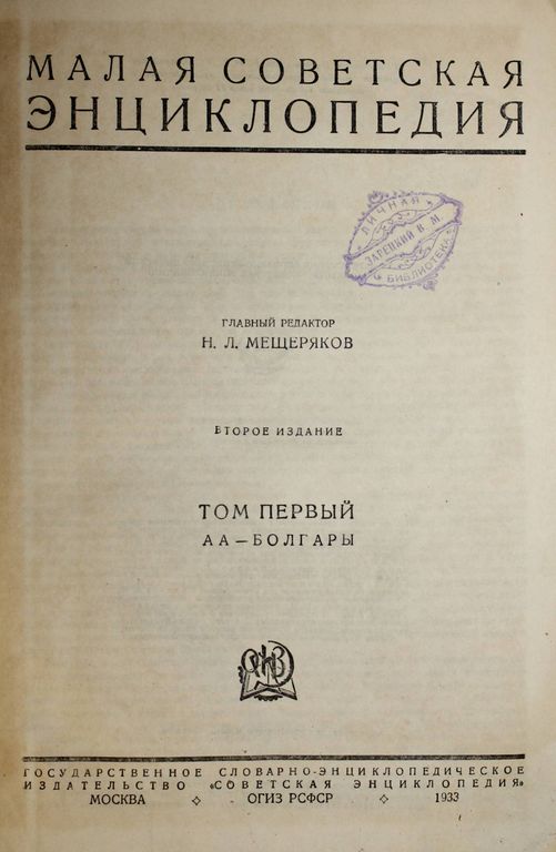 Малая Советская Энциклопедия (МСЭ) — универсальная энциклопедия среднего объема, выпускавшаяся в СССР издательством `Советская энциклопедия`. 1-е издание МСЭ вышло в 1928—1931 гг. тиражом 144 тысячи экземпляров. Оно состоит из 10-ти томов, содержащих более 30 тысяч статей, в которых наибольшее внимание отведено вопросам экономики и политики, а также технике. Издание содержит огромное количество иллюстраций, цветных карт, таблиц и вкладок. В предисловии к МСЭ отмечалось, что она призвана стать стать `...рупором пролетарской революции и средством для прояснения классового сознания широких масс трудящихся, орудием просвещения и строительства`. А в предисловии к последнему, Х-му тому указывается, что `Малая Советская Энциклопедия является первой законченной многотомной советской энциклопедией. Не только подробный, детальный анализ, но даже самый беглый просмотр ее показывает, что эта энциклопедия резко отличается от всех ранее появившихся дореволюционных энциклопедий. Поэтому опыт старых энциклопедий мог дам очень мало указаний для нашей работы. Строить энциклопедию приходилось совершенно по-новому, не имея перед собой никаких оборазцов`. Следует признать что действительно `опыт старых энциклопедий` был полностью отброшен редколлегией, а сама энциклопедия без сомнений совершенно уникальна, поскольку, например, статьи о Шопене, Штраусе или Шуберте явно меньше по объему, чем биографии никому неизвестных ныне `члена дирекции ин-та Ленина и пред. Союза воинствующих безбожников` Емельяна Ярославского, или же большевика Якова Аркадьевича Яковлева и коммунистки Варвары Николаевны Яковлевой... (впрочем, два последние были вскоре уничтожены самой Советской властью, - расстреляны как `враги народа`). И таких биографий репрессированных и расстреляннных `строителей нового мира`, превратившихся в одночасье во `врагов народа` насчитывается в этой энциклопедии - сотни (!). Ведь буквально через несколько лет после выхода в свет энциклопедии многие ее авторы и `персонажи` биографических очерков оказались врагами народа и были массово расстреляны. Впрочем, `великие исторические моменты, когда политическая власть, а вместе с ней и руль хозяйства переходят из рук отживающего класса в руки класса передового, всегда отмечаются значительным культурным подъемом`. Тиражи отдельных томов - 30000 - 81000 экз.