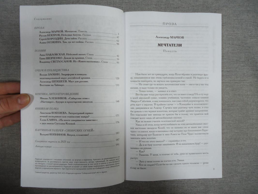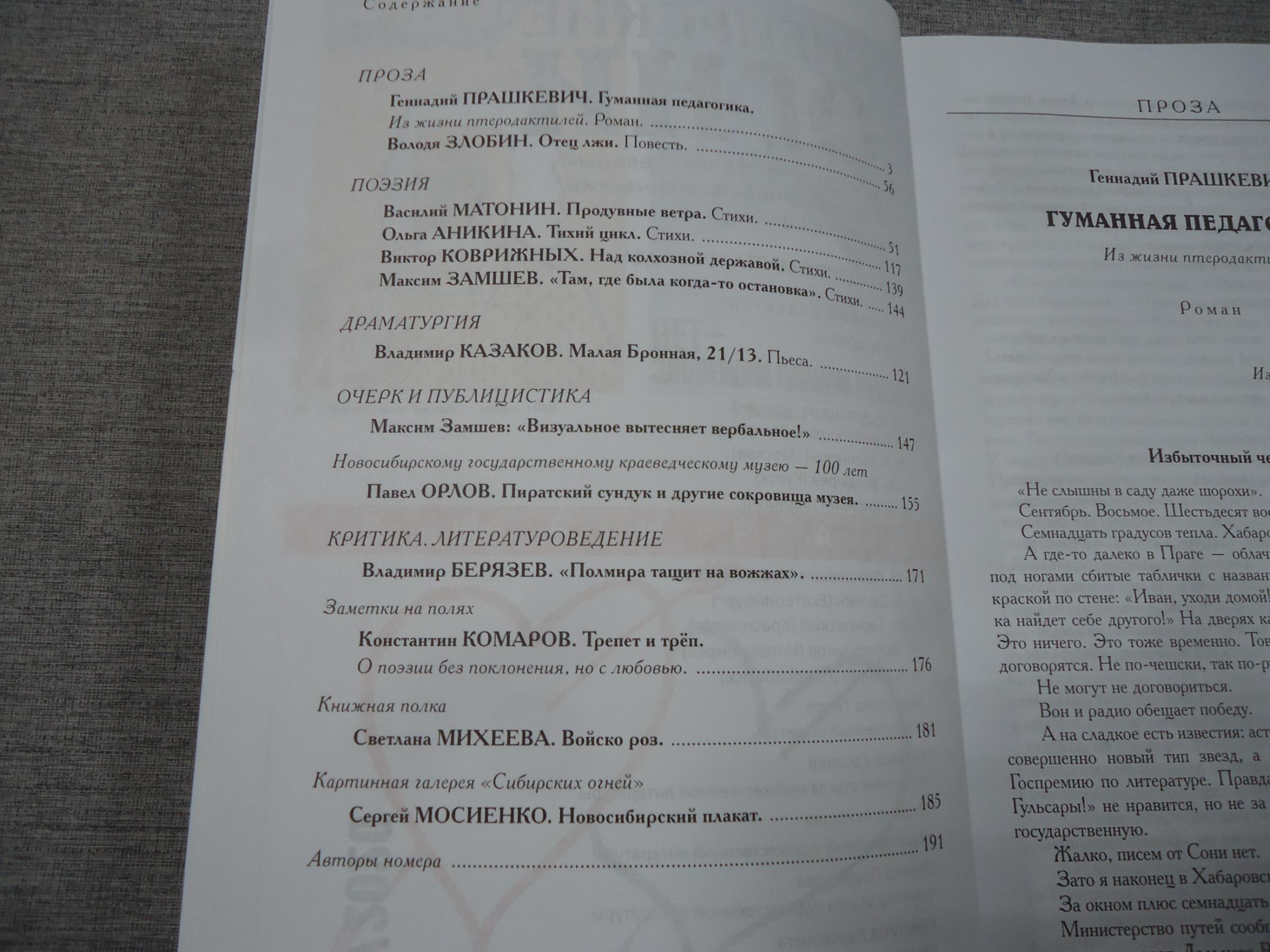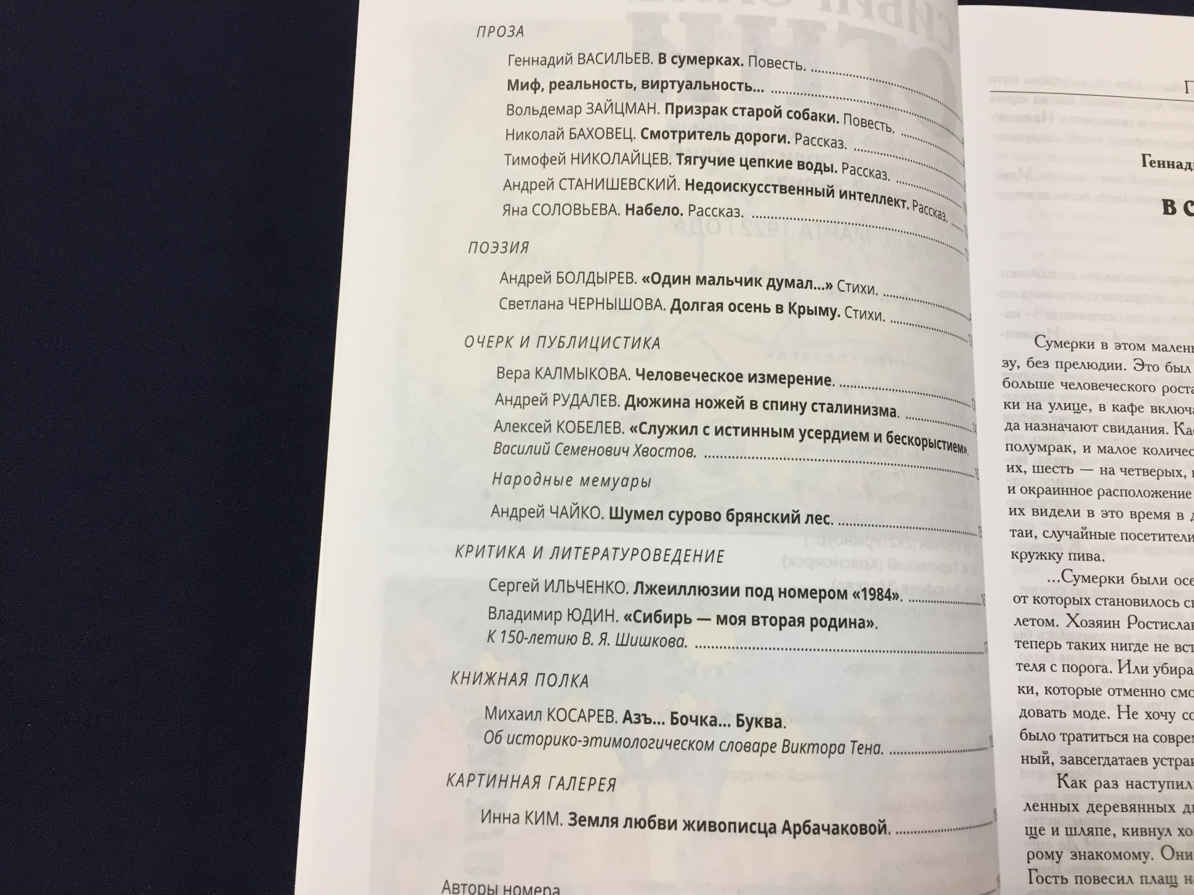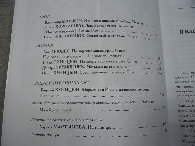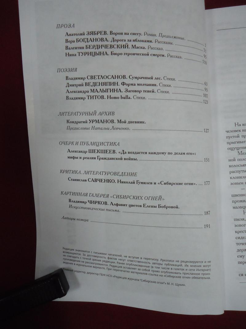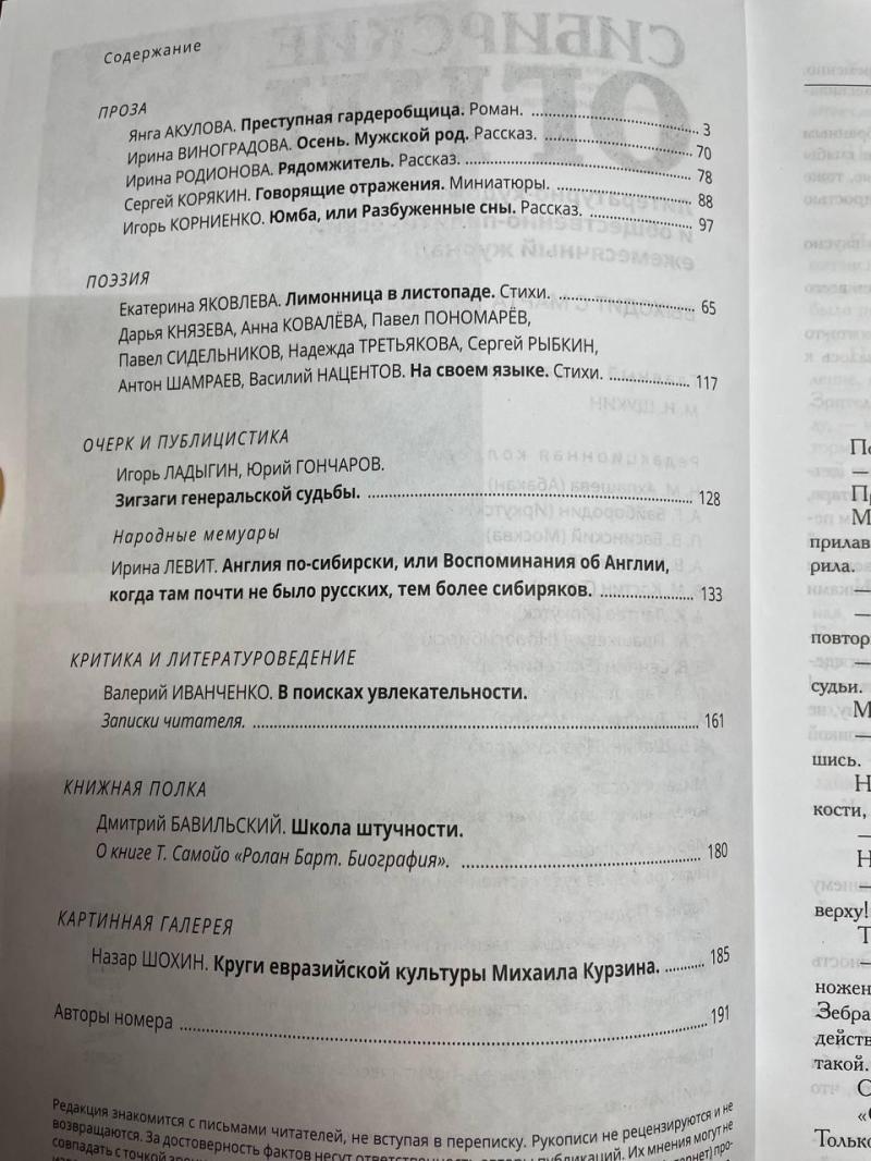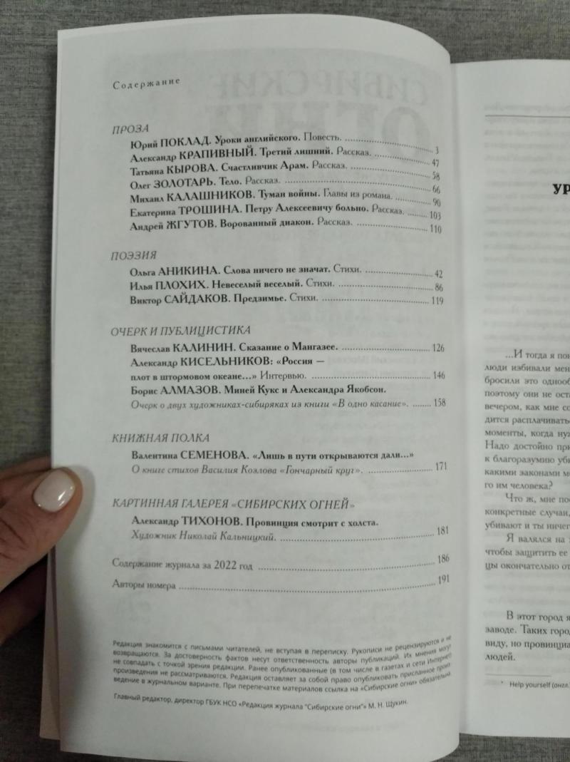 Ноябрьский номер открывает цикл рассказов Павла Крусанова `Путевые: снимки на память`. В нем автор пишет о молодежи, в девяностые пошедшей `в бандиты`, потому что именно эта `профессия` оказалась на тот момент востребованной, пишет в свойственной ему артистичной и отчасти элегической манере. Нотка ностальгии делает эту интонацию возможной. Рассказ молодого автора Тимура Бельского `Последнее исчезновение Аркадия Иблетова` рисует без глянца и без ретуши современный офис. Сомнительная контора, и человеческие отношения там складываются тоже сомнительные. Два главных героя стараются вести себя порядочно по отношению друг к другу, но этого недостаточно, чтоб отменить неминуемый финал... Последним школьным годам, трудному взрослению посвящен рассказ Ольги Егоровой `Чувств не показывать`. Завершает прозаическую часть номера рассказ - участник конкурса `Иду на грозу` - `Тормозное излучение, или Брям-шлям` доктора биологических наук Евгении Толстых. Стихотворные подборки Сергея Волкова `Тайный почерк и знак` и Александра Трунина `У старых дач` составили поэтический раздел. В очерке `Александр Аскольдов, автор фильма `Комиссар`. Правда и ложь` Владимир Левин рассказывает о своем участии в съемках знаменитого фильма и полной противоречий личности его режиссера. Хорошо известный всем любителям фольклора Борис Проталин во фрагменте своей мемуарной книги `Новосибирцы` рассказывает о совместной работе с братьями Заволокиными. В год 80-летия Победы продолжаем публиковать `человеческие документы` того судьбоносного времени. Мендель Пундик не воевал: отучившись в военном училище, он работал в военной приемке на одном из новосибирских оборонных предприятий. Однако его дневниковые записи многое расскажут о быте, переживаниях советского молодого человека той поры. Читателям `Сибирских огней` полюбились неторопливые, дотошные изыскания петербургского филолога Константина Васильева, развенчивающие мифы и общие места, заслоняющие порой реальные знания в области русской литературы. В очерке `Стрелялись! Через платок? С трех шагов? С ранением в пятку?` он разбирает факты и домыслы, имеющие отношения к дуэли поэта Кондратия Рылеева. Здесь же, в разделе критики и литературоведения, постоянный автор из Иркутска Светлана Михеева обращается к роману Глеба Пакулова `Гарь`, вышедшему двадцать лет назад, но до сих пор актуальному, как актуальна любая настоящая историческая проза. `Книжная полка` в ноябре содержит две рецензии. `Я предлагаю понимать...` Марии Знобищевой - отзыв на книгу Елизаветы Мартыновой `Провинциалы`, а `Вверх по Пинеге` Илоны Шевцовой посвящена роману Полины Максимовой `Верховье`. В `Картинной галерее` красноярский искусствовед Наталья Тригалева рассказывает о скульпторе Василии Сивцеве. Фотографии его работ иллюстрируют одиннадцатый номер