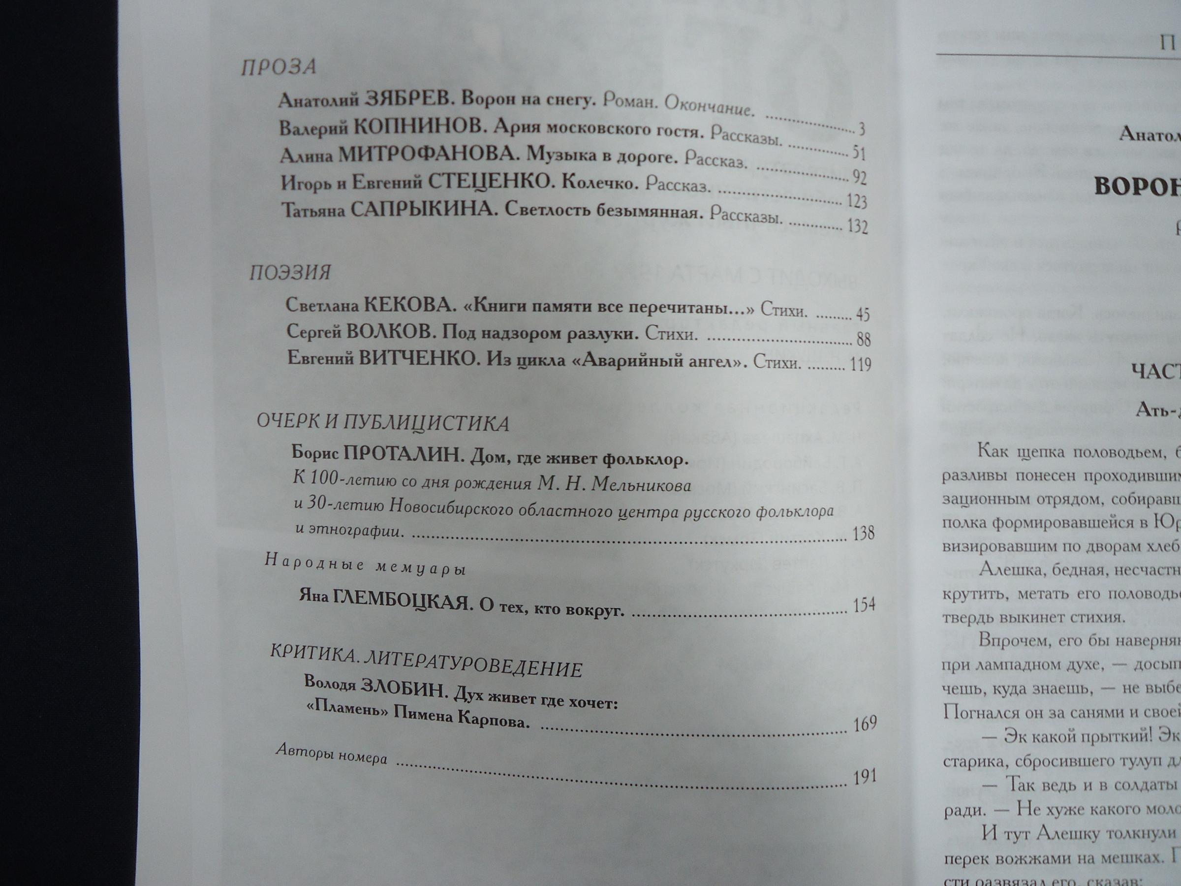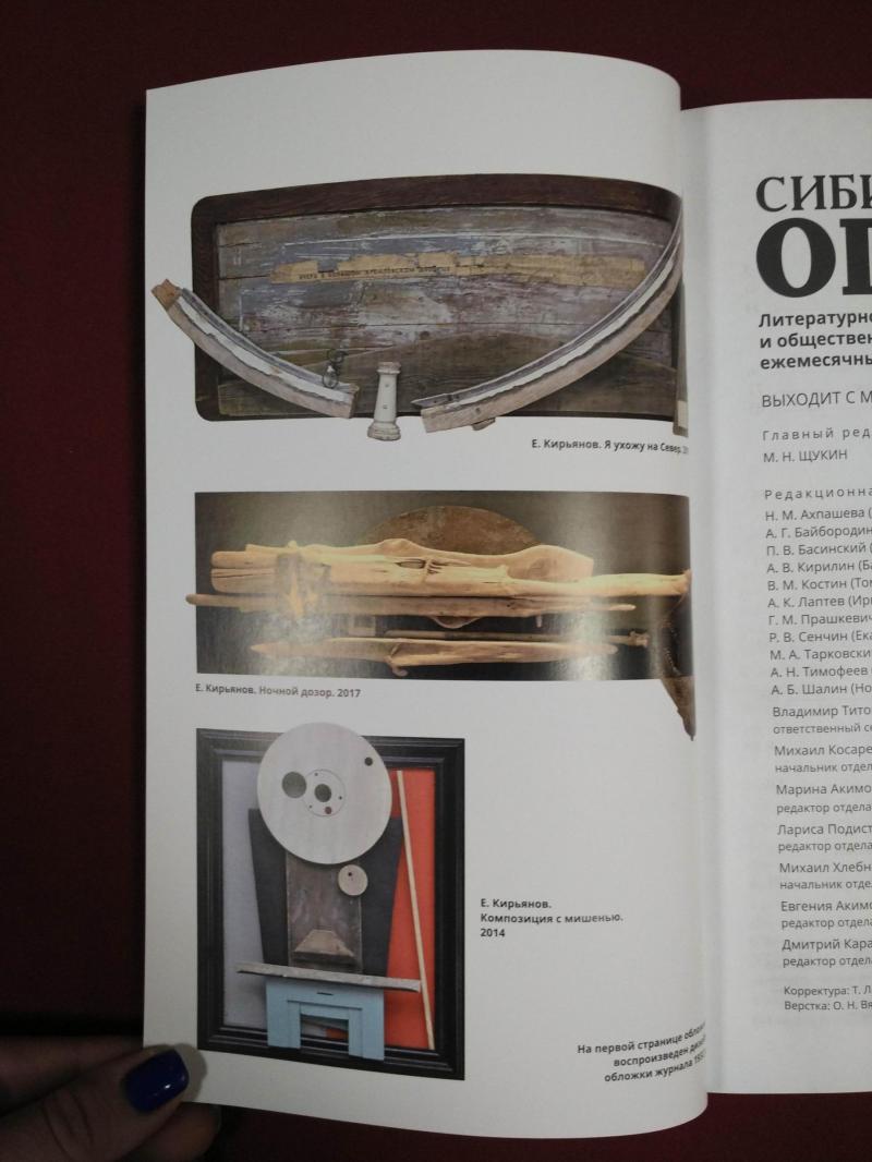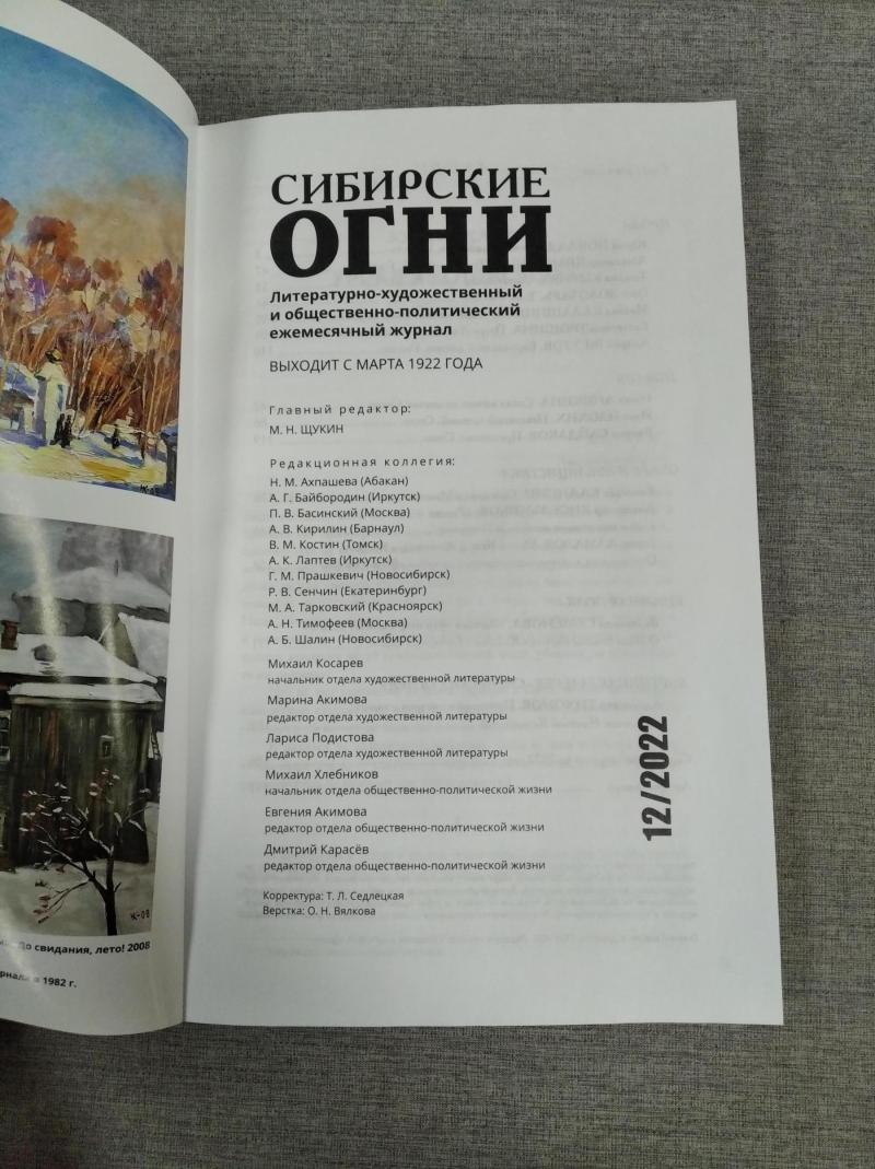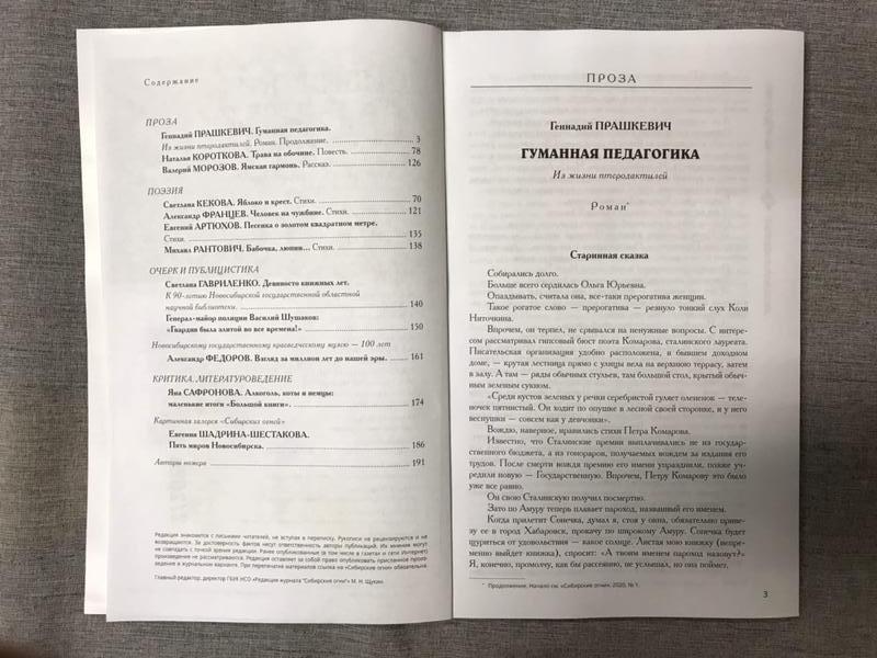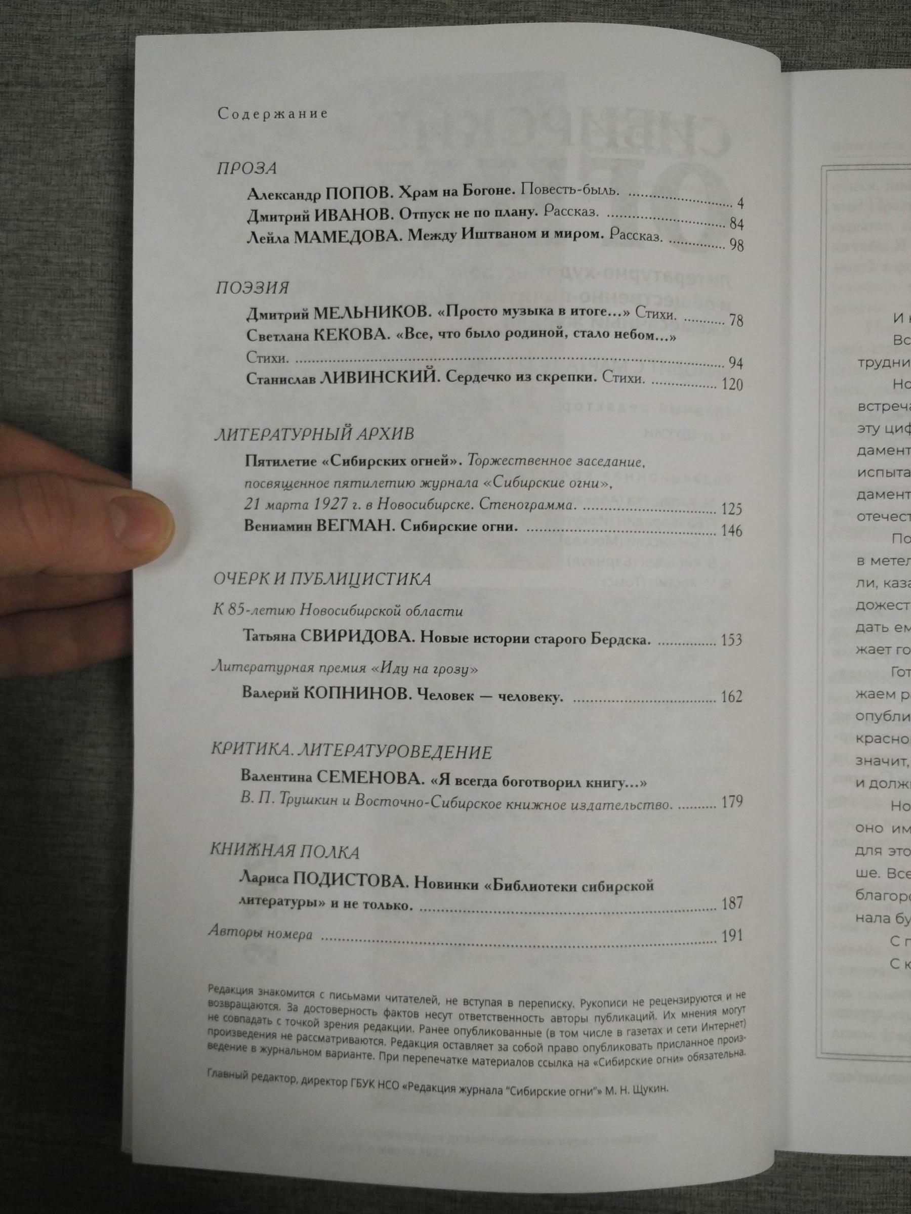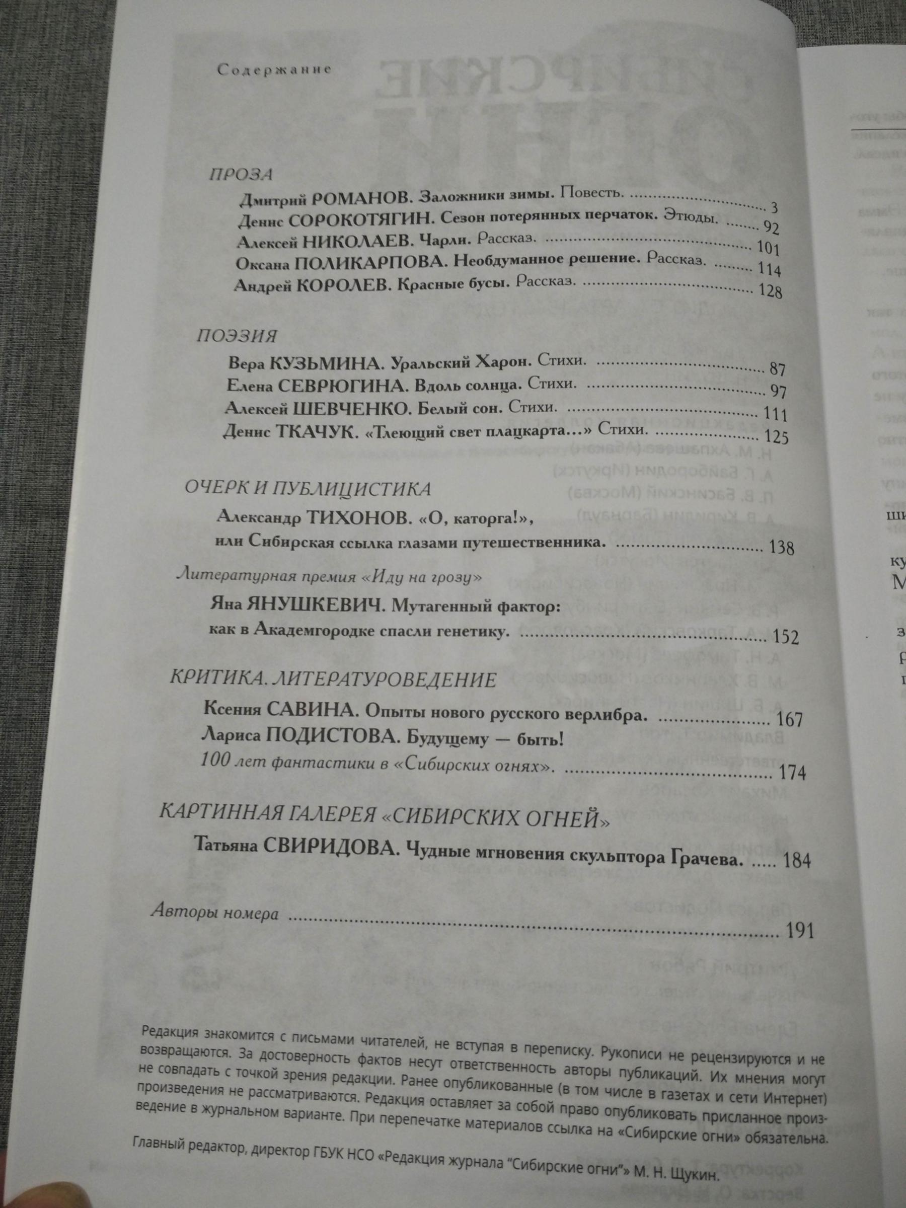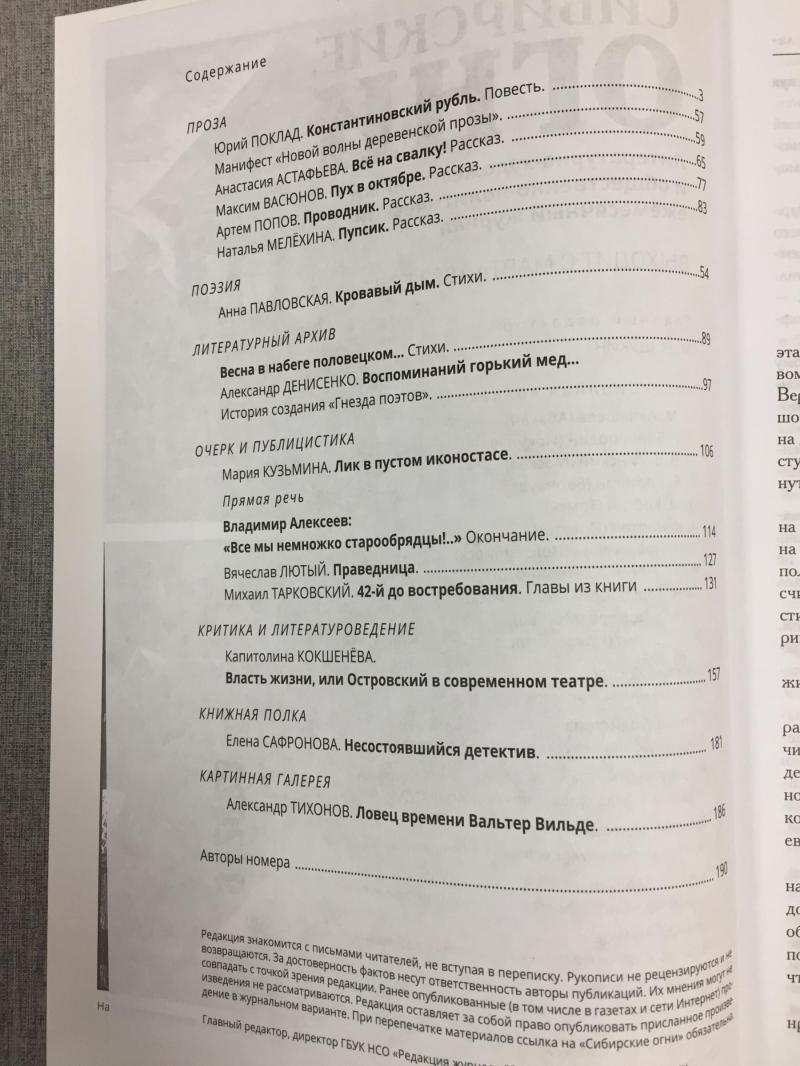 Ноябрьский номер открывает цикл рассказов Павла Крусанова `Путевые: снимки на память`. В нем автор пишет о молодежи, в девяностые пошедшей `в бандиты`, потому что именно эта `профессия` оказалась на тот момент востребованной, пишет в свойственной ему артистичной и отчасти элегической манере. Нотка ностальгии делает эту интонацию возможной. Рассказ молодого автора Тимура Бельского `Последнее исчезновение Аркадия Иблетова` рисует без глянца и без ретуши современный офис. Сомнительная контора, и человеческие отношения там складываются тоже сомнительные. Два главных героя стараются вести себя порядочно по отношению друг к другу, но этого недостаточно, чтоб отменить неминуемый финал... Последним школьным годам, трудному взрослению посвящен рассказ Ольги Егоровой `Чувств не показывать`. Завершает прозаическую часть номера рассказ - участник конкурса `Иду на грозу` - `Тормозное излучение, или Брям-шлям` доктора биологических наук Евгении Толстых. Стихотворные подборки Сергея Волкова `Тайный почерк и знак` и Александра Трунина `У старых дач` составили поэтический раздел. В очерке `Александр Аскольдов, автор фильма `Комиссар`. Правда и ложь` Владимир Левин рассказывает о своем участии в съемках знаменитого фильма и полной противоречий личности его режиссера. Хорошо известный всем любителям фольклора Борис Проталин во фрагменте своей мемуарной книги `Новосибирцы` рассказывает о совместной работе с братьями Заволокиными. В год 80-летия Победы продолжаем публиковать `человеческие документы` того судьбоносного времени. Мендель Пундик не воевал: отучившись в военном училище, он работал в военной приемке на одном из новосибирских оборонных предприятий. Однако его дневниковые записи многое расскажут о быте, переживаниях советского молодого человека той поры. Читателям `Сибирских огней` полюбились неторопливые, дотошные изыскания петербургского филолога Константина Васильева, развенчивающие мифы и общие места, заслоняющие порой реальные знания в области русской литературы. В очерке `Стрелялись! Через платок? С трех шагов? С ранением в пятку?` он разбирает факты и домыслы, имеющие отношения к дуэли поэта Кондратия Рылеева. Здесь же, в разделе критики и литературоведения, постоянный автор из Иркутска Светлана Михеева обращается к роману Глеба Пакулова `Гарь`, вышедшему двадцать лет назад, но до сих пор актуальному, как актуальна любая настоящая историческая проза. `Книжная полка` в ноябре содержит две рецензии. `Я предлагаю понимать...` Марии Знобищевой - отзыв на книгу Елизаветы Мартыновой `Провинциалы`, а `Вверх по Пинеге` Илоны Шевцовой посвящена роману Полины Максимовой `Верховье`. В `Картинной галерее` красноярский искусствовед Наталья Тригалева рассказывает о скульпторе Василии Сивцеве. Фотографии его работ иллюстрируют одиннадцатый номер