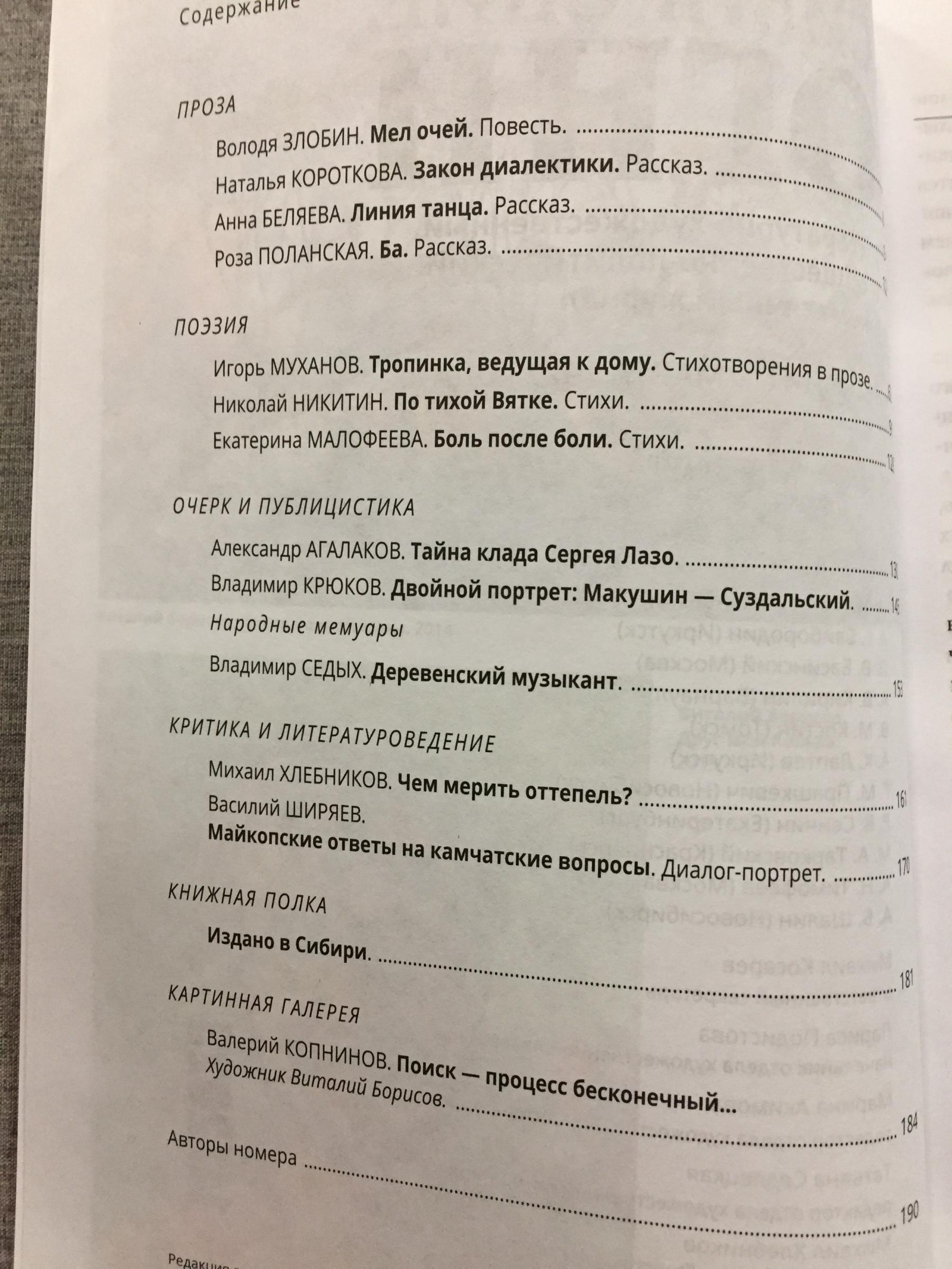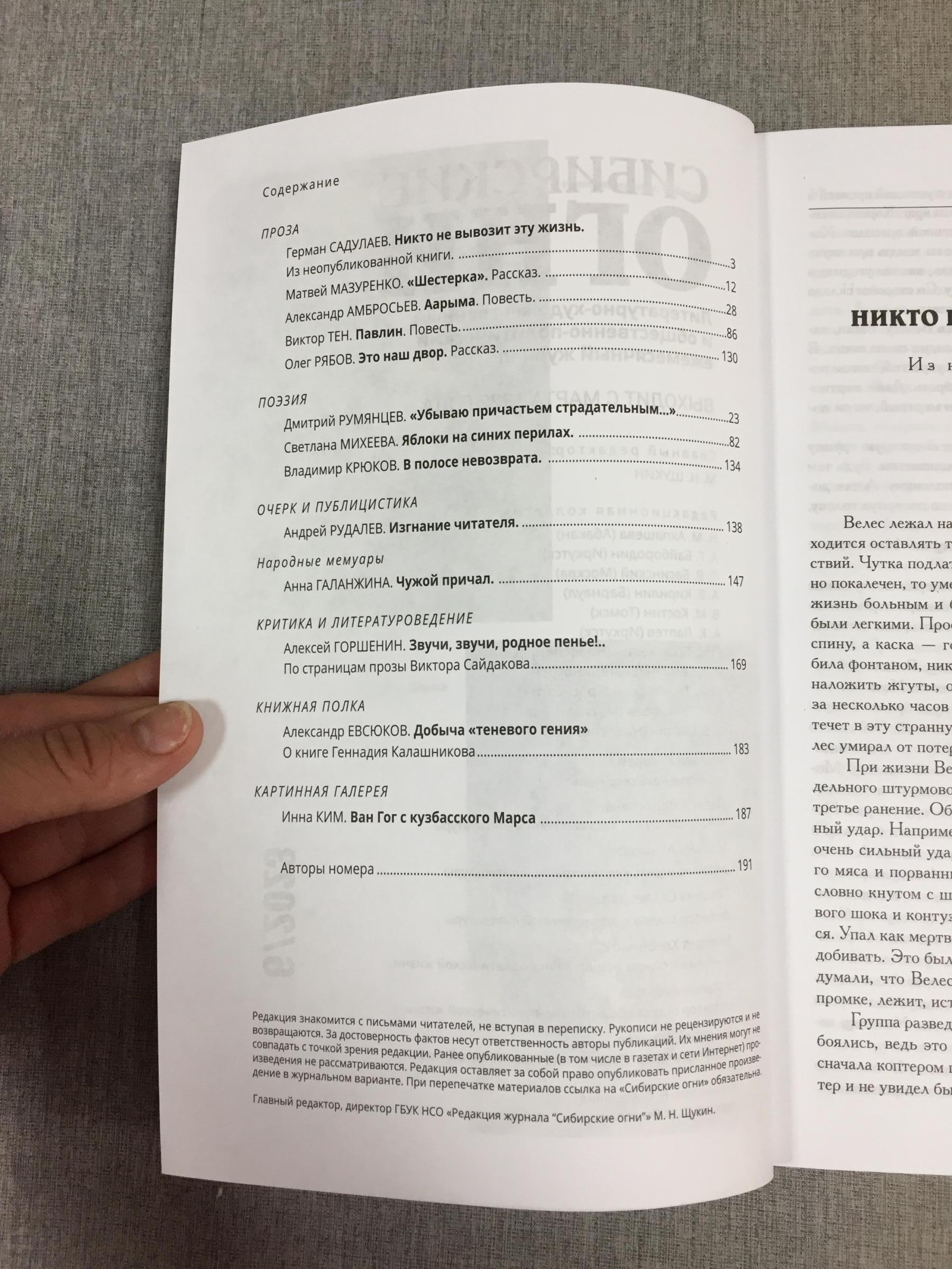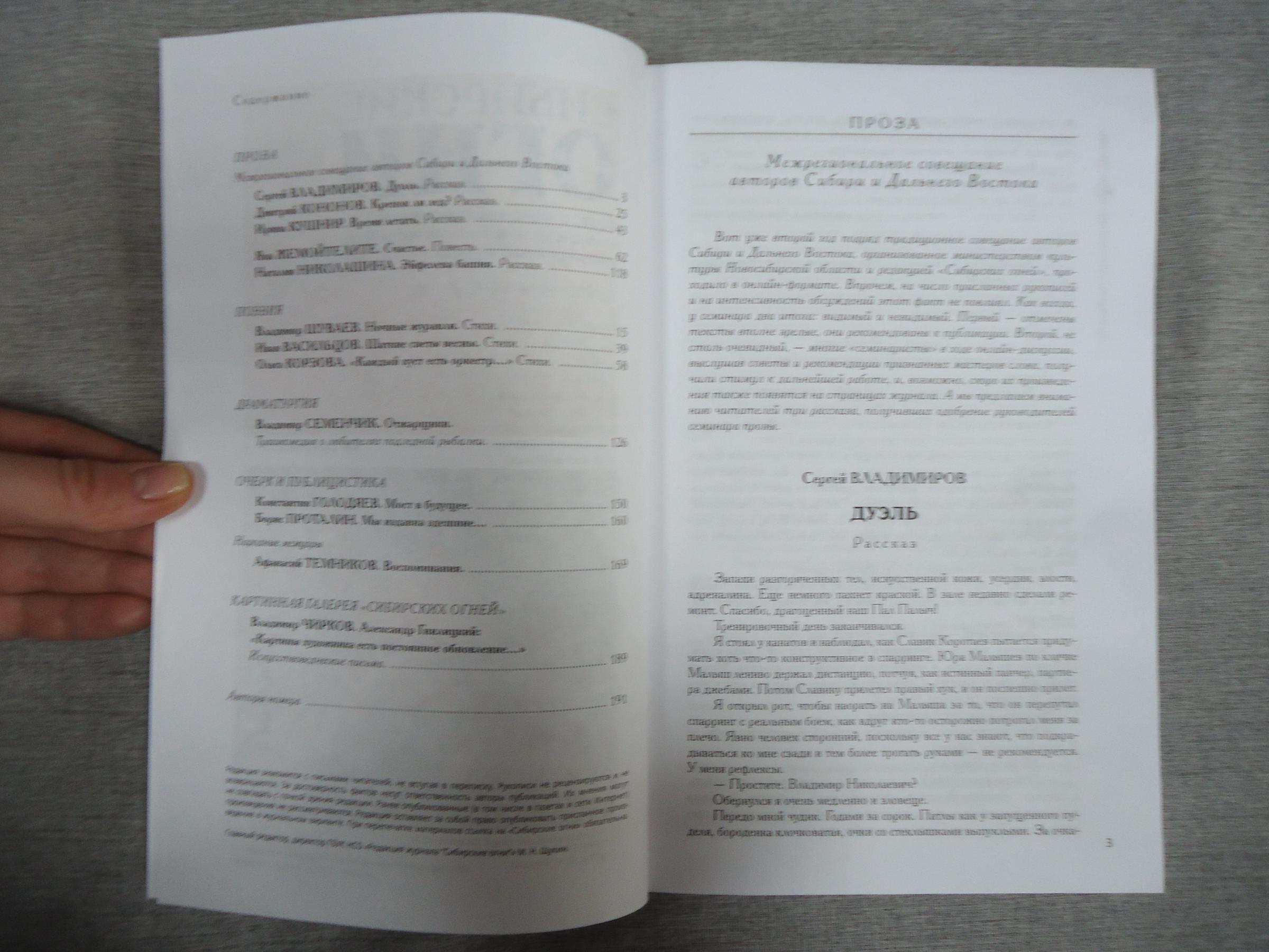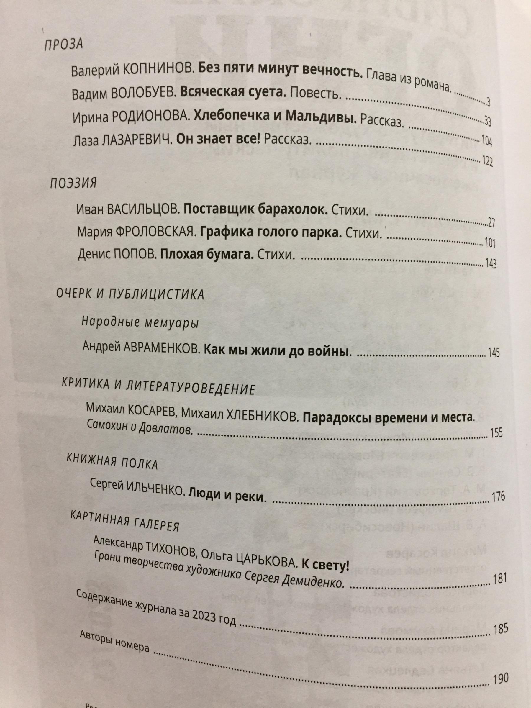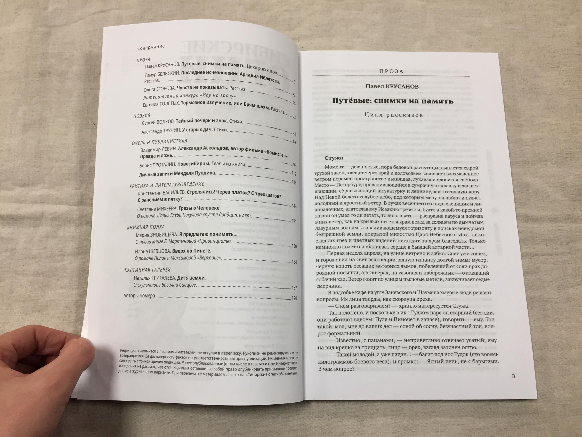 Ноябрьский номер открывает цикл рассказов Павла Крусанова `Путевые: снимки на память`. В нем автор пишет о молодежи, в девяностые пошедшей `в бандиты`, потому что именно эта `профессия` оказалась на тот момент востребованной, пишет в свойственной ему артистичной и отчасти элегической манере. Нотка ностальгии делает эту интонацию возможной. Рассказ молодого автора Тимура Бельского `Последнее исчезновение Аркадия Иблетова` рисует без глянца и без ретуши современный офис. Сомнительная контора, и человеческие отношения там складываются тоже сомнительные. Два главных героя стараются вести себя порядочно по отношению друг к другу, но этого недостаточно, чтоб отменить неминуемый финал... Последним школьным годам, трудному взрослению посвящен рассказ Ольги Егоровой `Чувств не показывать`. Завершает прозаическую часть номера рассказ - участник конкурса `Иду на грозу` - `Тормозное излучение, или Брям-шлям` доктора биологических наук Евгении Толстых. Стихотворные подборки Сергея Волкова `Тайный почерк и знак` и Александра Трунина `У старых дач` составили поэтический раздел. В очерке `Александр Аскольдов, автор фильма `Комиссар`. Правда и ложь` Владимир Левин рассказывает о своем участии в съемках знаменитого фильма и полной противоречий личности его режиссера. Хорошо известный всем любителям фольклора Борис Проталин во фрагменте своей мемуарной книги `Новосибирцы` рассказывает о совместной работе с братьями Заволокиными. В год 80-летия Победы продолжаем публиковать `человеческие документы` того судьбоносного времени. Мендель Пундик не воевал: отучившись в военном училище, он работал в военной приемке на одном из новосибирских оборонных предприятий. Однако его дневниковые записи многое расскажут о быте, переживаниях советского молодого человека той поры. Читателям `Сибирских огней` полюбились неторопливые, дотошные изыскания петербургского филолога Константина Васильева, развенчивающие мифы и общие места, заслоняющие порой реальные знания в области русской литературы. В очерке `Стрелялись! Через платок? С трех шагов? С ранением в пятку?` он разбирает факты и домыслы, имеющие отношения к дуэли поэта Кондратия Рылеева. Здесь же, в разделе критики и литературоведения, постоянный автор из Иркутска Светлана Михеева обращается к роману Глеба Пакулова `Гарь`, вышедшему двадцать лет назад, но до сих пор актуальному, как актуальна любая настоящая историческая проза. `Книжная полка` в ноябре содержит две рецензии. `Я предлагаю понимать...` Марии Знобищевой - отзыв на книгу Елизаветы Мартыновой `Провинциалы`, а `Вверх по Пинеге` Илоны Шевцовой посвящена роману Полины Максимовой `Верховье`. В `Картинной галерее` красноярский искусствовед Наталья Тригалева рассказывает о скульпторе Василии Сивцеве. Фотографии его работ иллюстрируют одиннадцатый номер