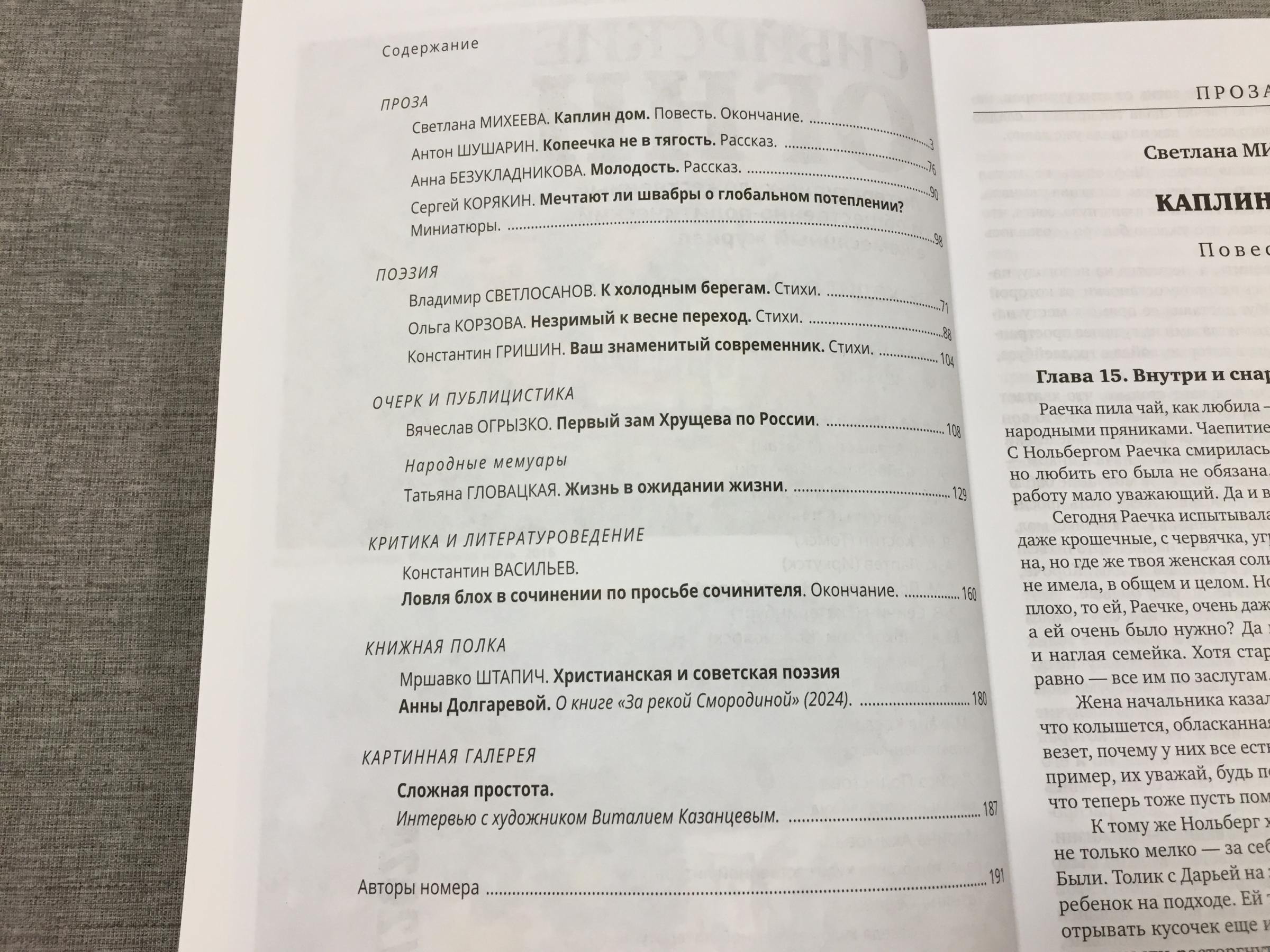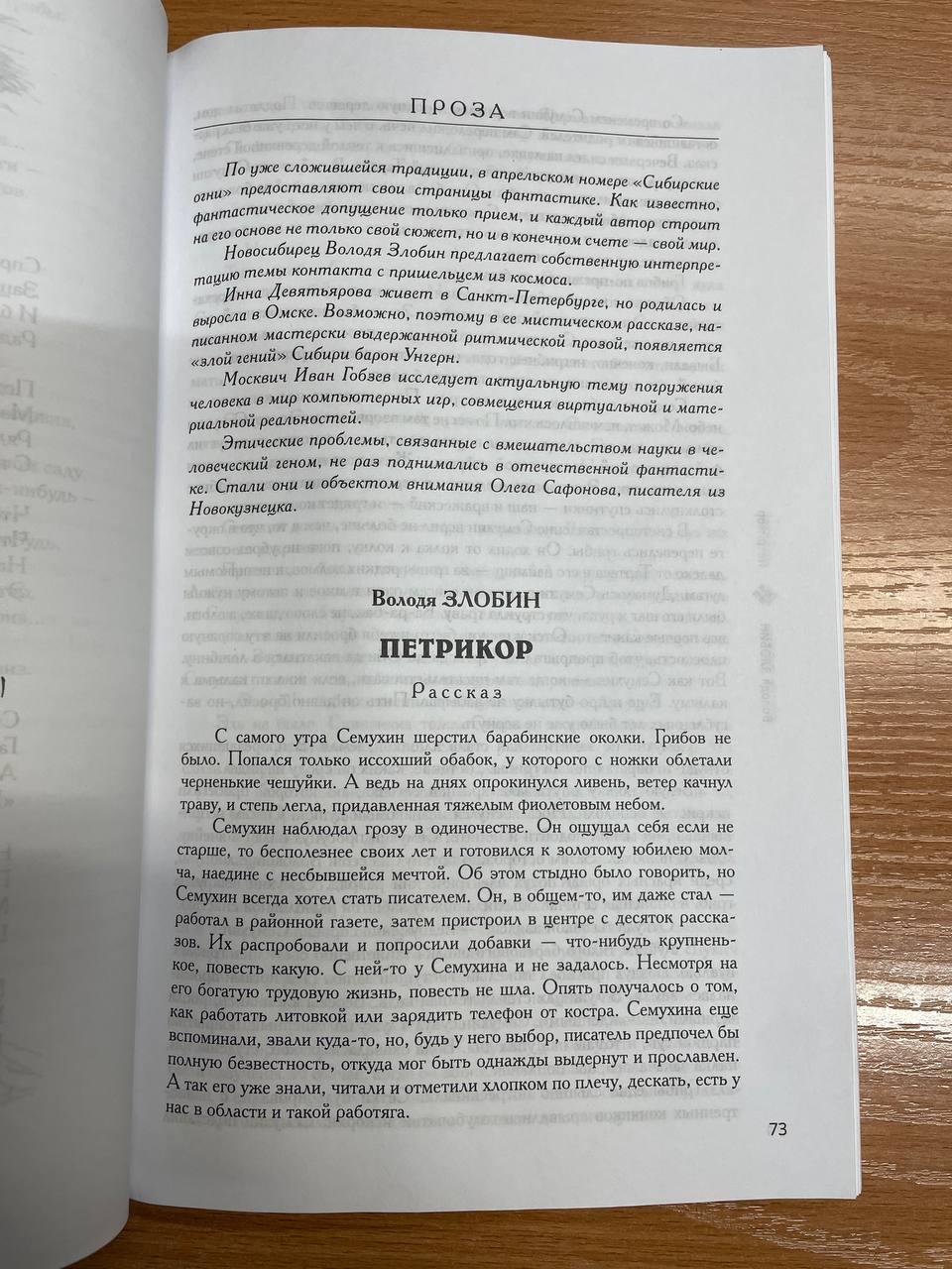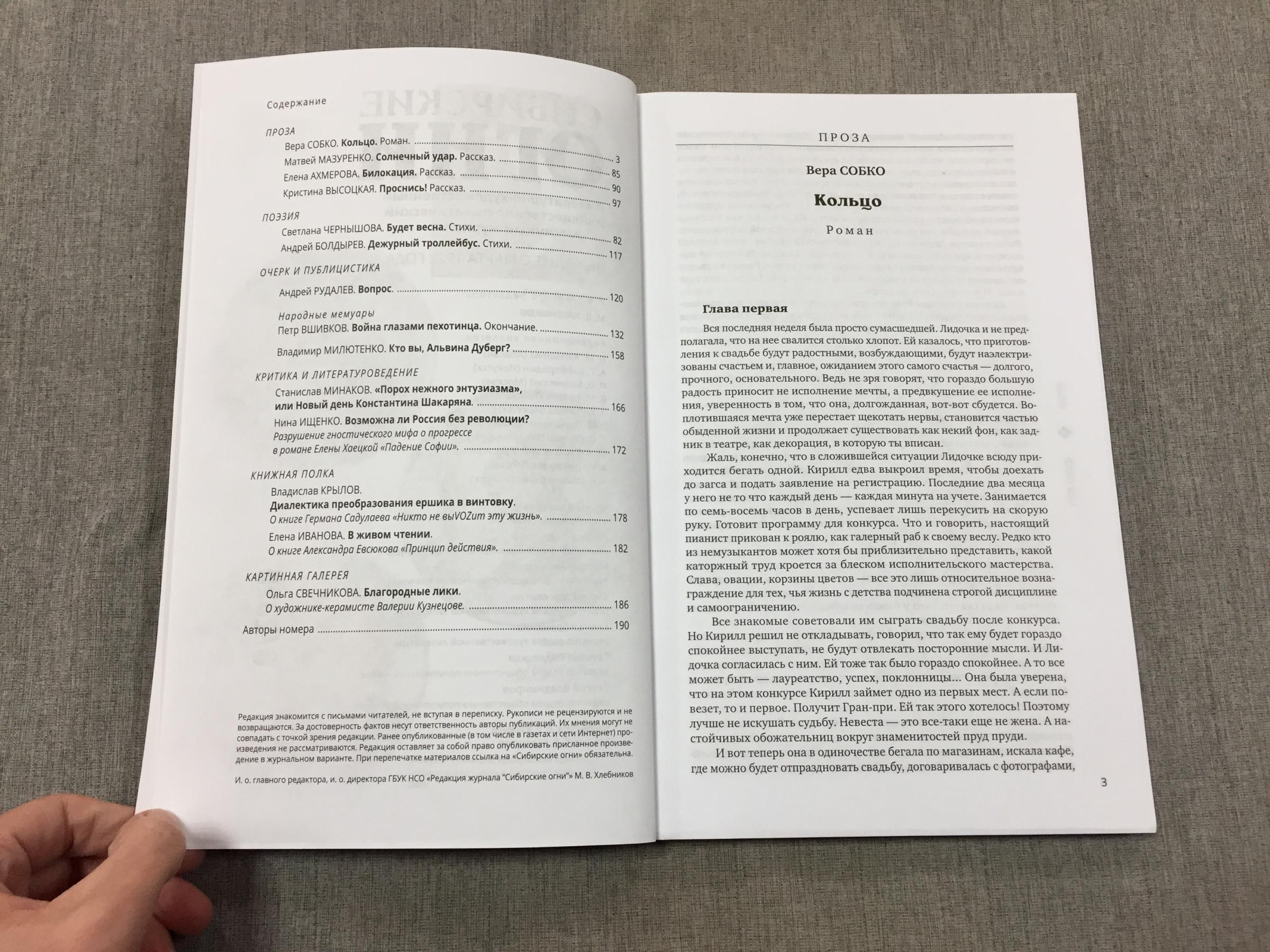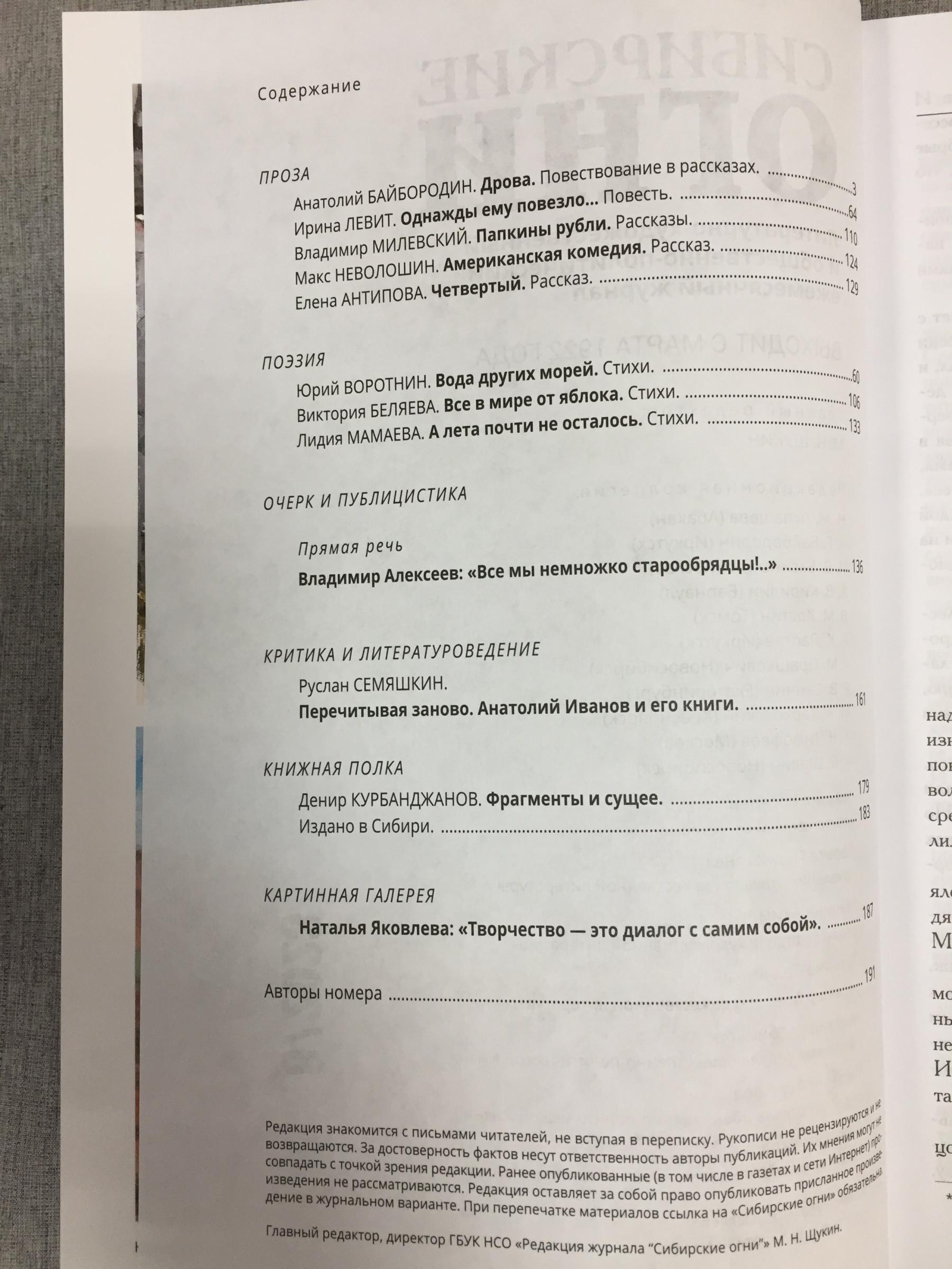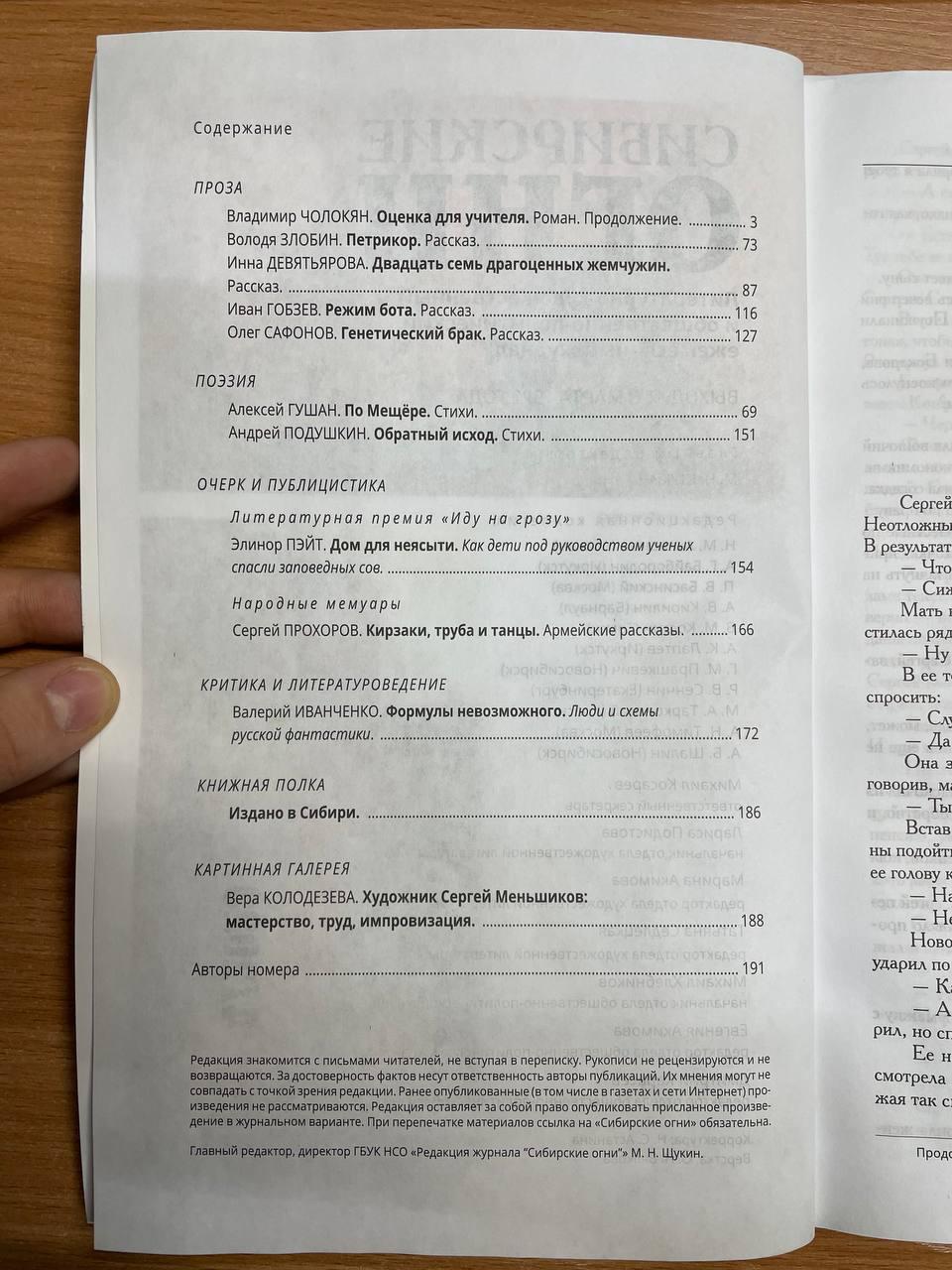 Ноябрьский номер открывает цикл рассказов Павла Крусанова `Путевые: снимки на память`. В нем автор пишет о молодежи, в девяностые пошедшей `в бандиты`, потому что именно эта `профессия` оказалась на тот момент востребованной, пишет в свойственной ему артистичной и отчасти элегической манере. Нотка ностальгии делает эту интонацию возможной. Рассказ молодого автора Тимура Бельского `Последнее исчезновение Аркадия Иблетова` рисует без глянца и без ретуши современный офис. Сомнительная контора, и человеческие отношения там складываются тоже сомнительные. Два главных героя стараются вести себя порядочно по отношению друг к другу, но этого недостаточно, чтоб отменить неминуемый финал... Последним школьным годам, трудному взрослению посвящен рассказ Ольги Егоровой `Чувств не показывать`. Завершает прозаическую часть номера рассказ - участник конкурса `Иду на грозу` - `Тормозное излучение, или Брям-шлям` доктора биологических наук Евгении Толстых. Стихотворные подборки Сергея Волкова `Тайный почерк и знак` и Александра Трунина `У старых дач` составили поэтический раздел. В очерке `Александр Аскольдов, автор фильма `Комиссар`. Правда и ложь` Владимир Левин рассказывает о своем участии в съемках знаменитого фильма и полной противоречий личности его режиссера. Хорошо известный всем любителям фольклора Борис Проталин во фрагменте своей мемуарной книги `Новосибирцы` рассказывает о совместной работе с братьями Заволокиными. В год 80-летия Победы продолжаем публиковать `человеческие документы` того судьбоносного времени. Мендель Пундик не воевал: отучившись в военном училище, он работал в военной приемке на одном из новосибирских оборонных предприятий. Однако его дневниковые записи многое расскажут о быте, переживаниях советского молодого человека той поры. Читателям `Сибирских огней` полюбились неторопливые, дотошные изыскания петербургского филолога Константина Васильева, развенчивающие мифы и общие места, заслоняющие порой реальные знания в области русской литературы. В очерке `Стрелялись! Через платок? С трех шагов? С ранением в пятку?` он разбирает факты и домыслы, имеющие отношения к дуэли поэта Кондратия Рылеева. Здесь же, в разделе критики и литературоведения, постоянный автор из Иркутска Светлана Михеева обращается к роману Глеба Пакулова `Гарь`, вышедшему двадцать лет назад, но до сих пор актуальному, как актуальна любая настоящая историческая проза. `Книжная полка` в ноябре содержит две рецензии. `Я предлагаю понимать...` Марии Знобищевой - отзыв на книгу Елизаветы Мартыновой `Провинциалы`, а `Вверх по Пинеге` Илоны Шевцовой посвящена роману Полины Максимовой `Верховье`. В `Картинной галерее` красноярский искусствовед Наталья Тригалева рассказывает о скульпторе Василии Сивцеве. Фотографии его работ иллюстрируют одиннадцатый номер