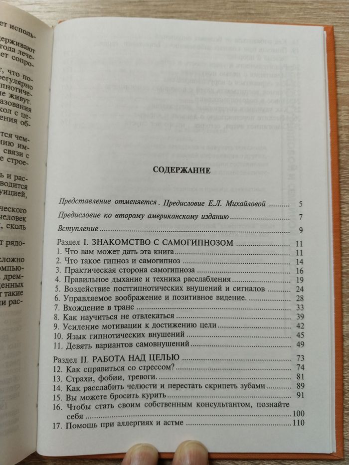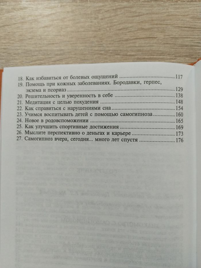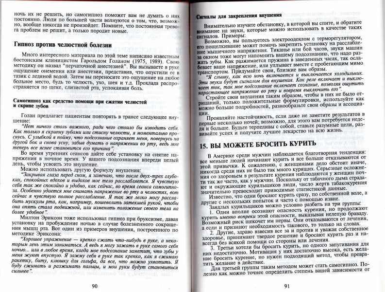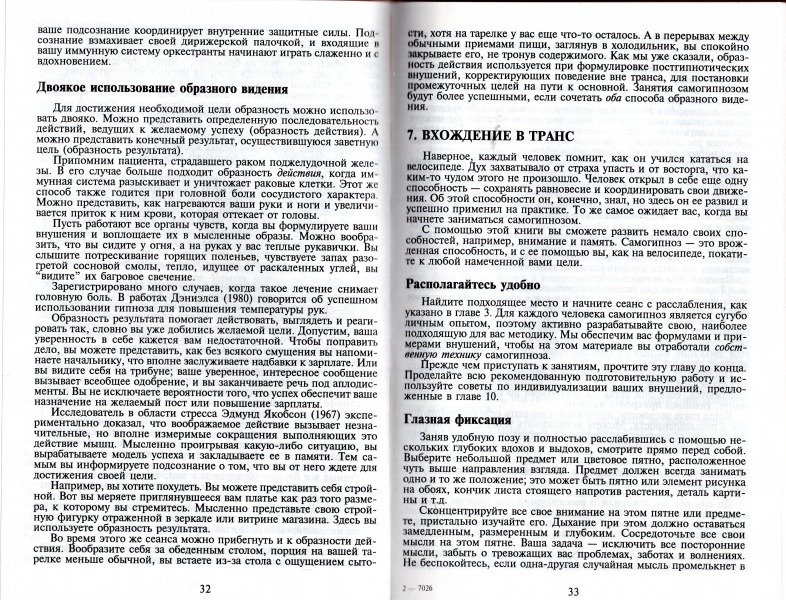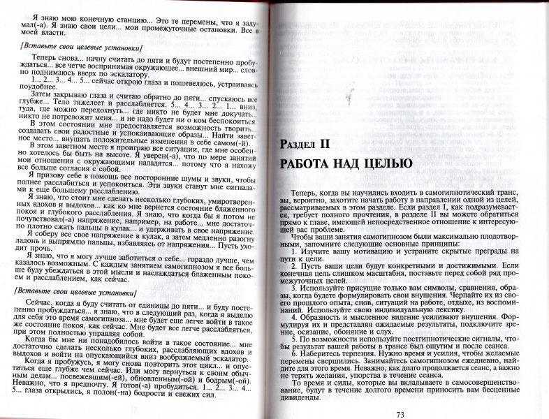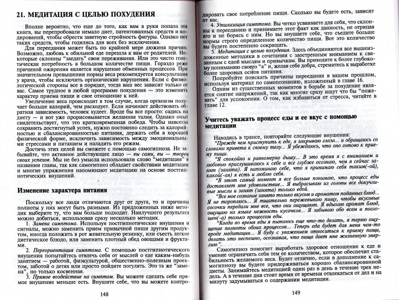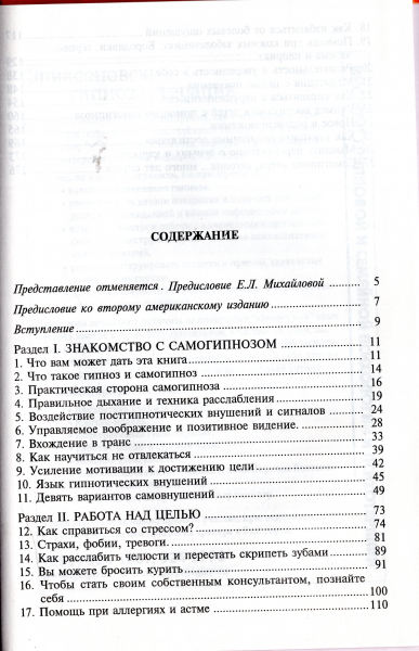 Великолепное и действительно полное руководство. Десятки конкретных упражнений посвящаются одной только технике вхождения в транс разной степени глубины. Авторы подробно рассматривают все, что может помочь или помешать самостоятельной работе читателя, постепенно вводя его в курс дела и всегда оставляя выбор за ним. А выбирать есть из чего: одних современных базовых техник самогипноза в руководстве описано девять, а модификаций и вариантов может быть без счета. Авторы рассказывают о критериях успеха и трудностях: советуют, что из их `ларца сокровищ` лучше подходит для решения той или иной проблемы. Список возможных областей применения предлагаемых техник весьма внушителен. От обычного грамотного расслабления в ситуации стресса до борьбы со страхами и приступами тревоги, от снятия боли до улучшения состояния кожи, от помощи в родах до избавления от лишнего веса... Плюс борьба с бессонницей, повышение уверенности в себе, улучшение спортивных показателей и многое другое. Книгу можно было бы назвать энциклопедией самопомощи. Написана она в спокойной, уважительной манере: так могут беседовать с читателями люди, которые действительно знают, о чем говорят. Тираж 2 000 экз. Вес без упаковки 280 г.