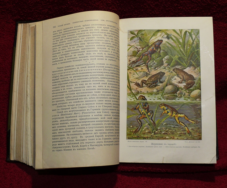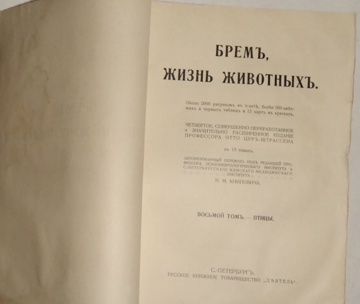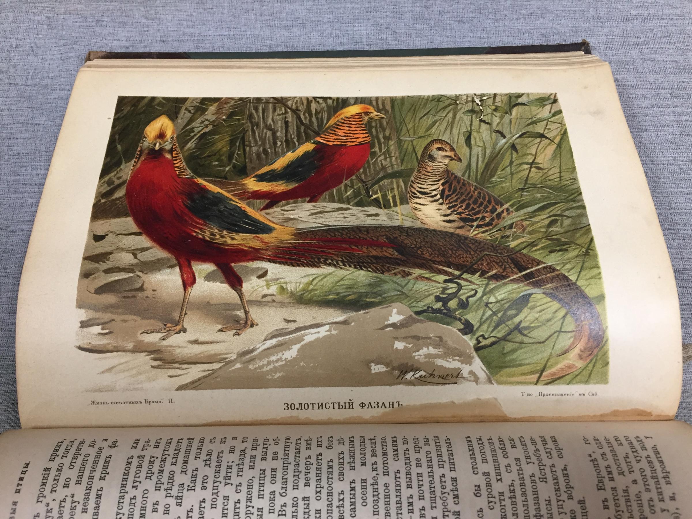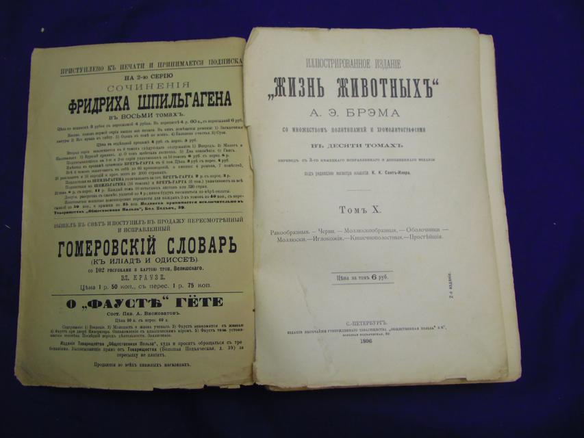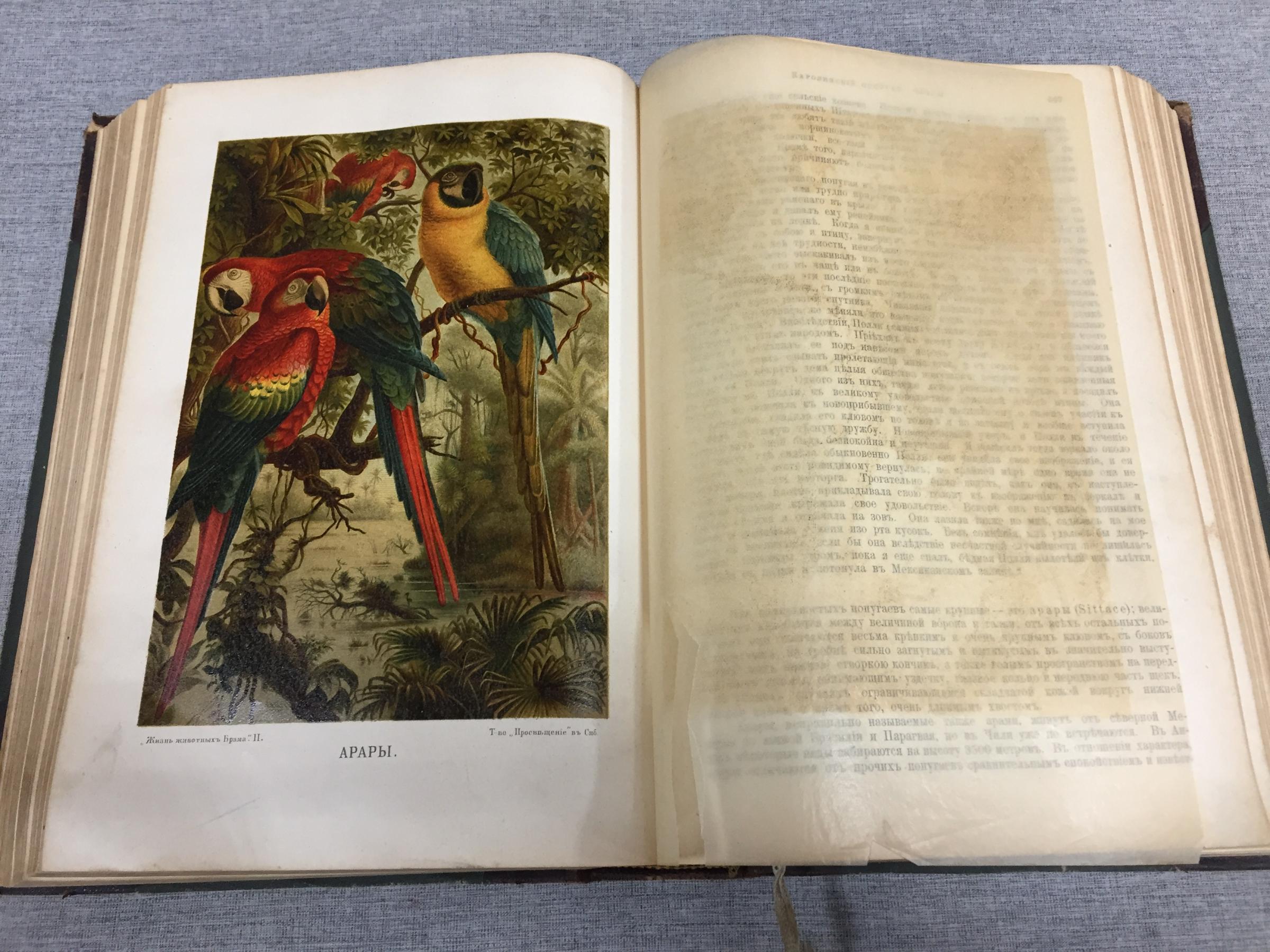 | 108 | BS-Orion Москва. СПб. Типография Товарищества `Просвещение` 1903г. XLIII, 1066, 2, [6] с., илл. + л. фронт. (портр.), 26 вкл. илл. + карта Твердый владельческий (бумвинил.-ледериновый) темно-зелено-коричневый переплет, энциклопедический формат. Состояние: хорошее, с утратами 3 хромолитографий (еще 2 вклейки заметно подрезаны и вклеены не на свои места в блоке) и карты. Бумвинил. корешок и уголки крышек блока - современные (профессионально реставрированные): ледериновые крышки - издательские. Все страницы и ч/б вклейки в наличии, утрачены три цветные вклейки (`Хамелеон`,`Макроподы` и `Иноземныя цикады`) и карта, кальки утрачены все (кроме одной): часть хромолитографий немного обрезаны. Блок крепкий, страницы чистые. |