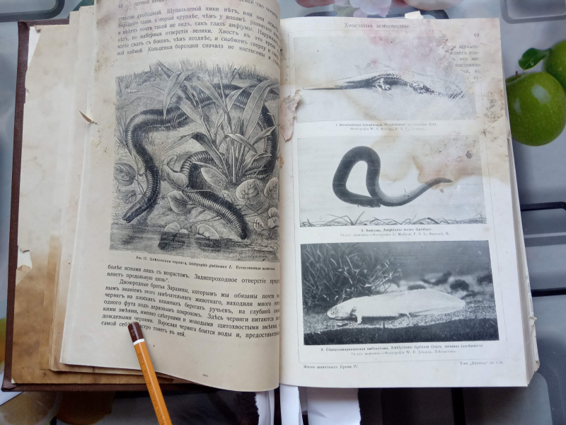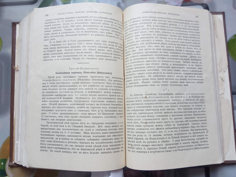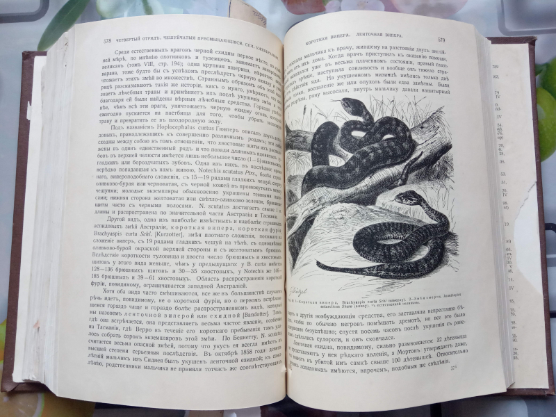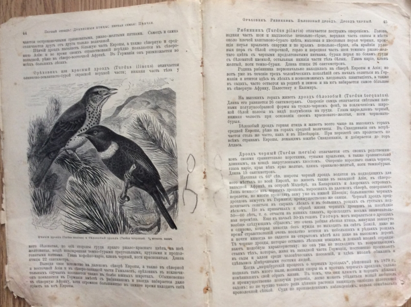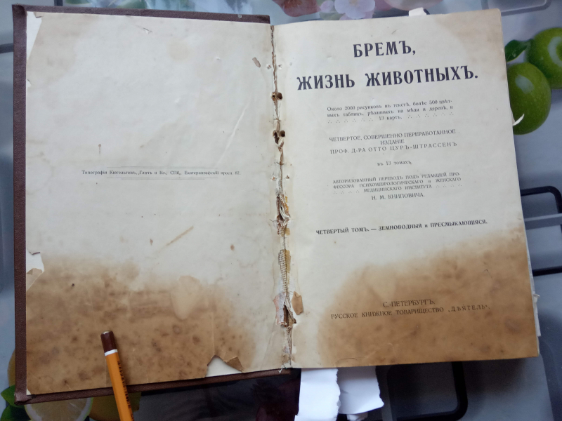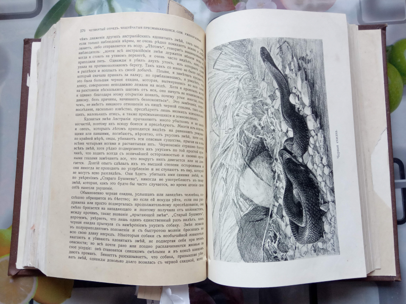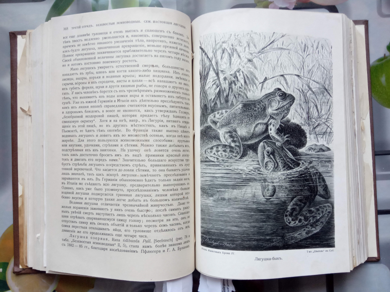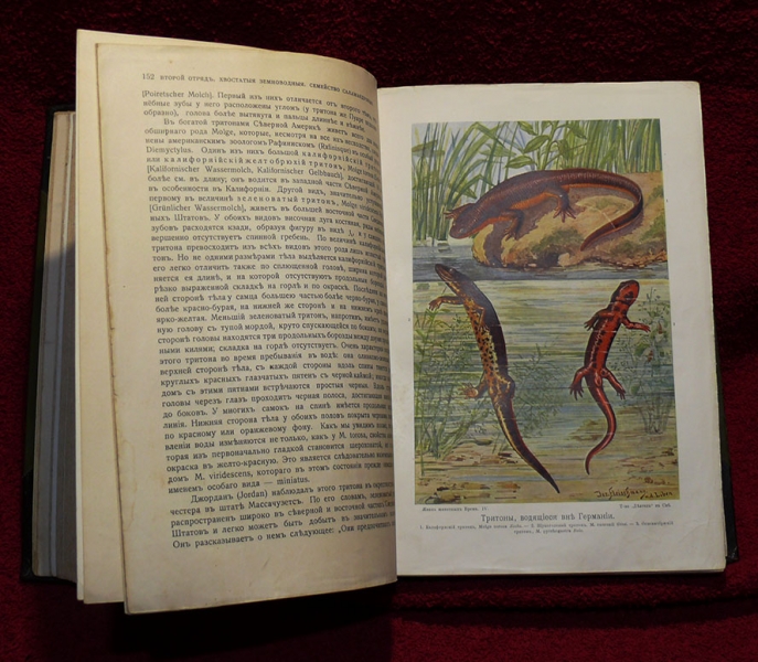 | 108 | BS-Orion Москва. СПб. Типография Товарищества `Просвещение` 1903г. XLIII, 1066, 2, [6] с., илл. + л. фронт. (портр.), 26 вкл. илл. + карта Твердый владельческий (бумвинил.-ледериновый) темно-зелено-коричневый переплет, энциклопедический формат. Состояние: хорошее, с утратами 3 хромолитографий (еще 2 вклейки заметно подрезаны и вклеены не на свои места в блоке) и карты. Бумвинил. корешок и уголки крышек блока - современные (профессионально реставрированные): ледериновые крышки - издательские. Все страницы и ч/б вклейки в наличии, утрачены три цветные вклейки (`Хамелеон`,`Макроподы` и `Иноземныя цикады`) и карта, кальки утрачены все (кроме одной): часть хромолитографий немного обрезаны. Блок крепкий, страницы чистые. |