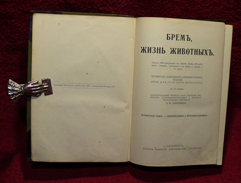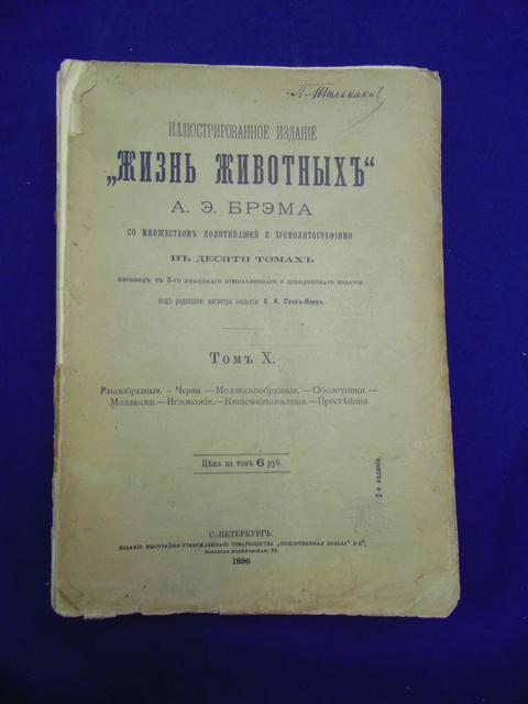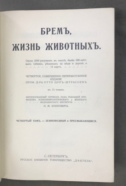 | 117 | BS-Orion Москва. С.-Петербург Русское книжное Товарищество `Деятель` - Типография Кюгельгель, Гличь и Ко 1913г. ХХ, 752 с., илл. + 19 цв. и 29 ч/б вкл. Твердый издательский (полукожаный) эпохи черно-коричневый и кожаными уголками и позолотой корешка переплет, энциклопедический формат. Состояние: удовлетворительное, переплет б.м. хорошее (умеренные потертости углов корешка и кожаных уголков крышек переплета), вклейки - в наличии. С переднего форзаца содрана бумага (с левой половины), у нахзаца свободная половина отсутствует. Разрисован простым карандашом чистый авантитул. Потрепаны и взлохмачены уголки блока с загибом уголков краевых страниц. Следы от пролистывания, небольшие пятна, помятости и надрывы отдельных листов. Отметки советских букинистических магазинов на чистом последнем листе. Утрачено большинство калек перед вклейками, несколько вклеек немного разрисованы. Все вклейки на месте (проверено!). Красивый владельческий синий штемпельный экслибрис на авантитуле. Книга из библиотеки известного зоолога, член-корр. РАН Э.В. Ивантера. |