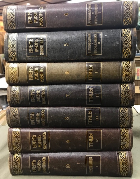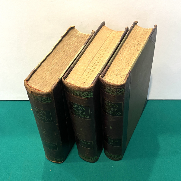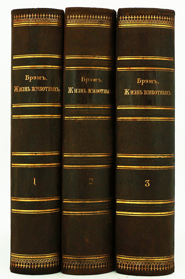 | 160 | BS-Knigant.ru Москва. СПб.: «Просвещение», 1902-1903. Том 1. Млекопитающие: XXI, 853, 6 c., 10 л. хромолитографиями, 16 л. ч/б табл. и 221 рис в тексте. Том 2. Птицы: XXI, 880, 6 c., с 10 л. хромолитографиями, 19 л. ч/б таблицами и 225 рис. в тексе. Том 3. Пресмыкающиеся, зем 1902-1903г. В трех шикарных цельнокожаных переплетах с золотым тиснием и бинтовым корешком. Тонированные и обрезы украшены золотыми узорами, ляссе, дублюра с золотым тиснением. За свободными листами форзацев вклеен лист от переплетной мастерской: `Ручной переплет нас 26х19 см. Состояние: отличное Фото – Фото – Фото – Фото – Фото – Фото – Фото – Фото – Фото – Фото |