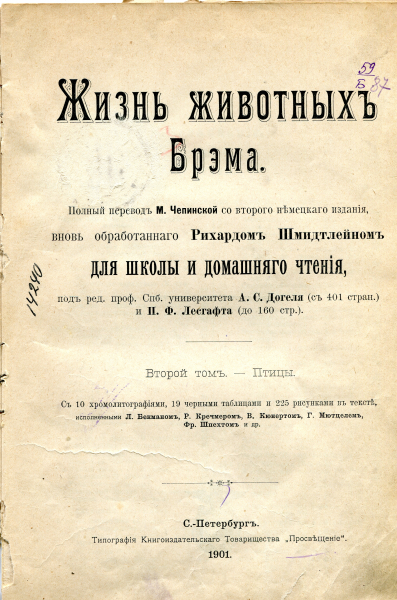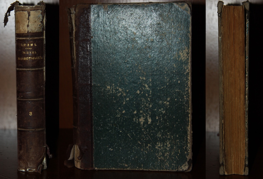 | 116 | BS-Orion Москва. С.-Петербург Русское Книжное Товарищество `Деятель` 1913(?)г. VIII, 592 с. + 22 цв. и 16 ч/б вкл. илл. Твердый владельческий (полукожаный) глухой довоенный с мраморно-картонными крышками и черным корешком переплет, энциклопедический формат. Состояние: переплет - удовлетворительное (сильные потертости корешка и довольно значительные - крышек): блок - очень хорошее (утрачены окончание оглавления (стр.IX-XII) и несколько цв. и ч/б вклеек: небольшие следы влаги по правому полю нескольких страниц в начале и конце блока). Блок крепкий, страницы чистые, без печатей, штампов, отметок и записей. Красивый владельческий синий штемпельный экслибрис на переднем форзаце. Книга из библиотеки известного зоолога, член-корр. РАН Э.В. Ивантера. |