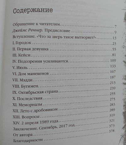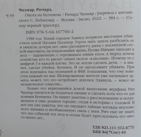 1988 год. Тихий городок Эджвуд потрясен жестоким убийством пятнадцатилетней Наташи Галлахер. Утром мать зашла разбудить ее и увидела: кровать дочери пуста, окно распахнуто, на подоконнике кровь. Позже Наташу находят в лесу – задушенную, с отрезанным левым ухом. А перед домом жертвы нарисованные синим мелом «классики» с загадочной цифрой 3 в каждой клетке… Но в округе нет маленьких детей, так что это наверняка сделал убийца. И он продолжает убивать, издеваясь над полицией и ФБР, показывая, что ему известен каждый их шаг. По городу расползается слух, что зло, убивающее местных девушек – вовсе не человек… Бугимен. Только что вернувшийся домой выпускник журфака Рич Чизмар пытается не поддаваться панике и сделать хоть что-то для поимки Бугимена. И вот он уже ощущает тайные взгляды неуловимого маньяка и необъяснимую связь с ним. Рич еще не знает, что эхо этих зловещих событий будет преследовать его много-много лет… Незаурядный триллер о серийном убийце, пропитанный ужасом провинциальных городков в духе Кинга, с настоящей криминальной документалистикой, богатым иллюстративным материалом и собственным расследованием автора.