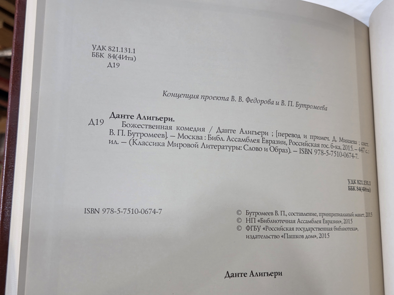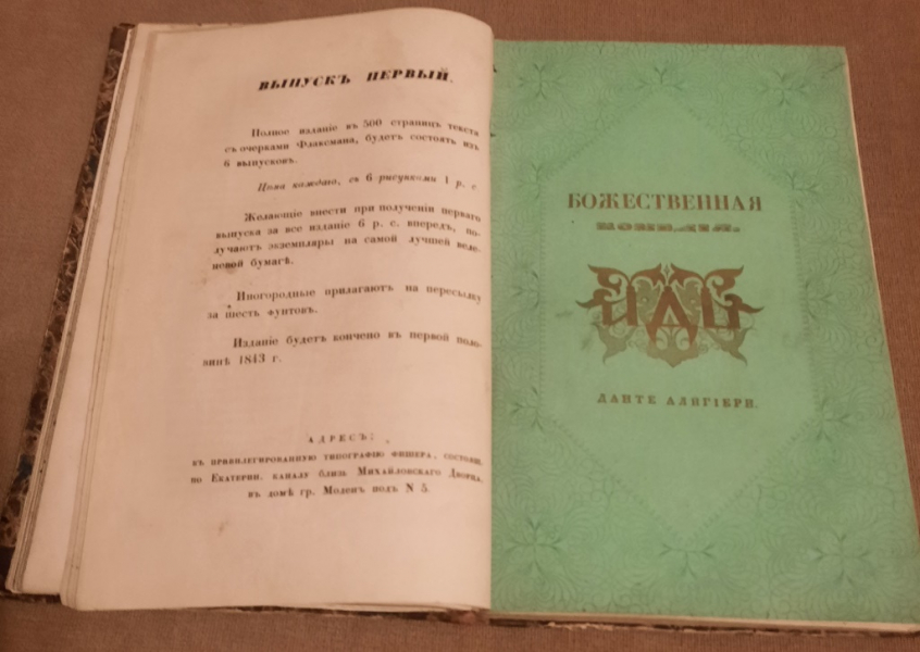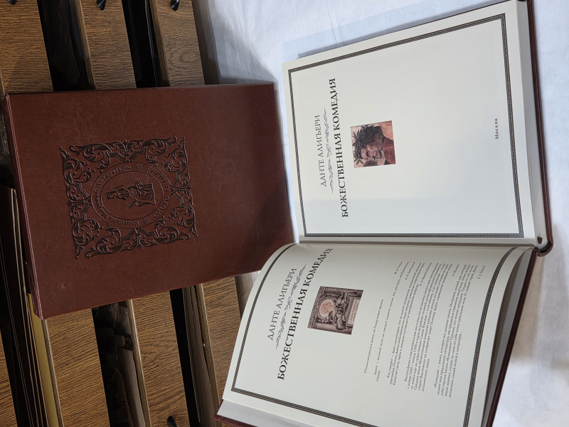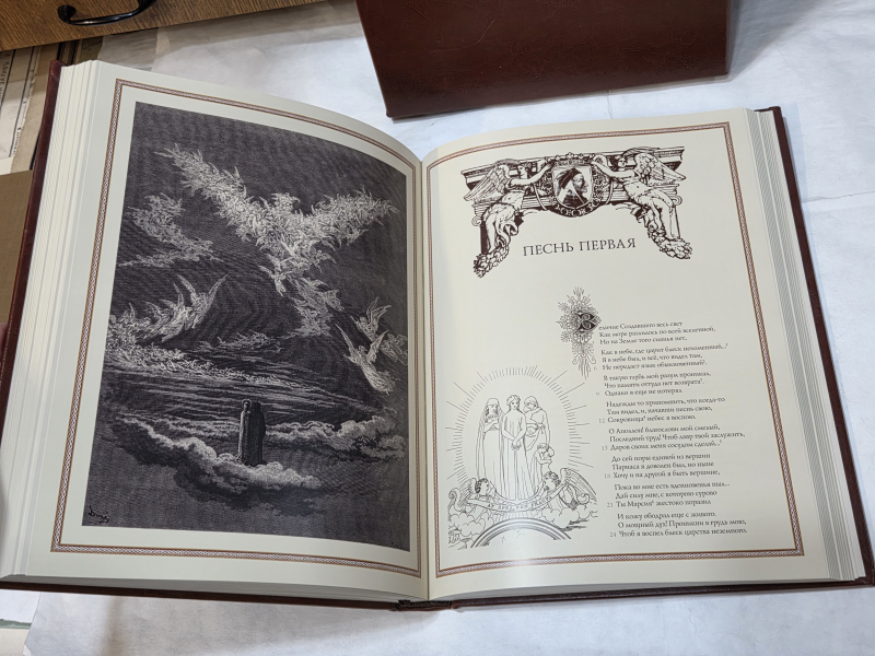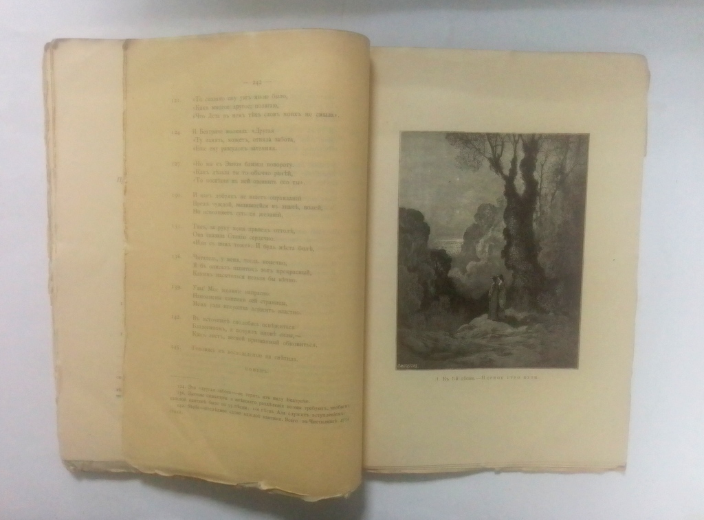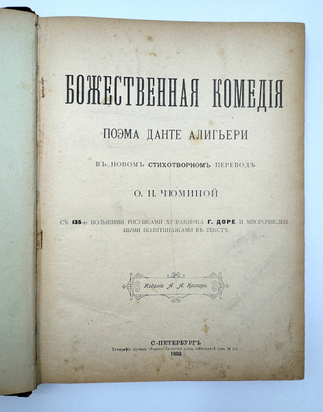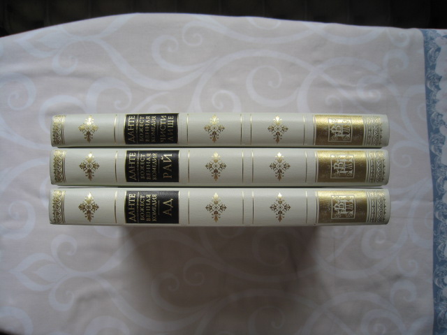 | 217 | BS-Knigant.ru Москва. Лейпциг: Издание М.О. Вольфа, [1874-1879]. Ч. 1: Ад. 1874. [6], 257 с., 1 л. фронт., 75 л. ил. Т. 2: Чистилище. 1876. [8], 320 с., 1 л. фронт. (ил.), 9 л. ил. Т. 3: Рай. 1879. [4], 305 с., 1 л. фронт. (ил.), 4 л. ил. [1874-1879]г. В двух роскошных цельнокожаных переплетах, выполненных под издательские. Составные форзацы из муара. Золотые, узорные обрезы. Ляссе. В блоках встречаются редкие лисьи пятна. Книги вложены в подносной полукожаный короб, обитый изнутри бархатом., 32х27 см. Состояние: отличное Фото – Фото – Фото – Фото – Фото – Фото – Фото – Фото – Фото |