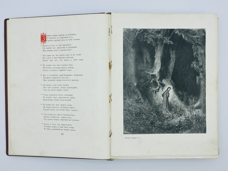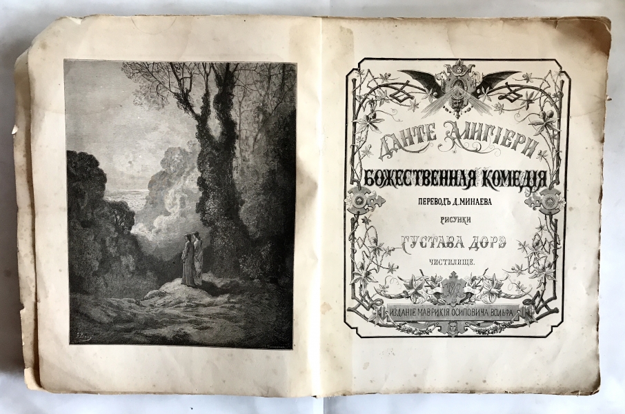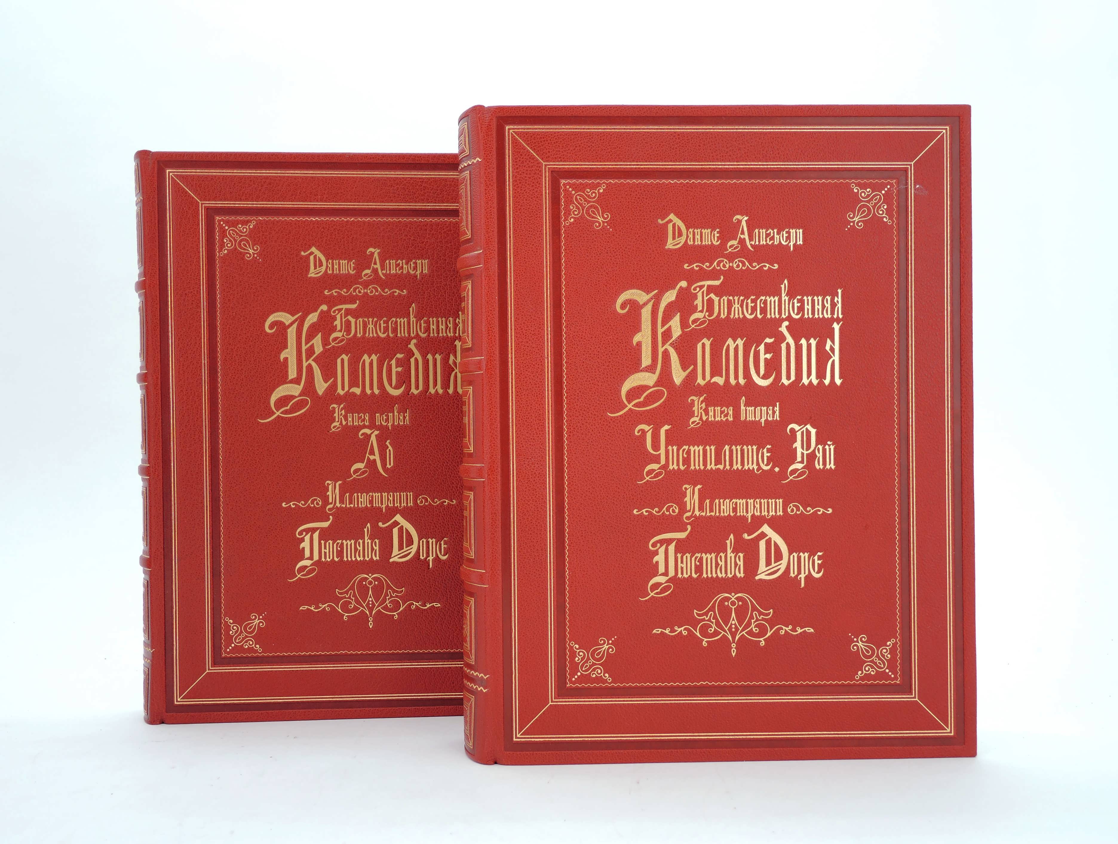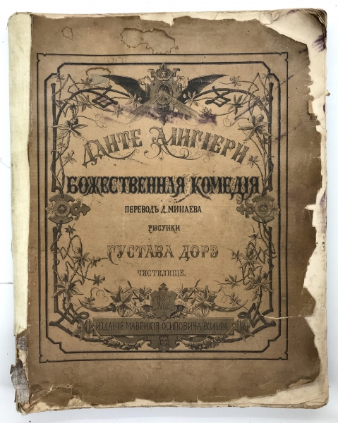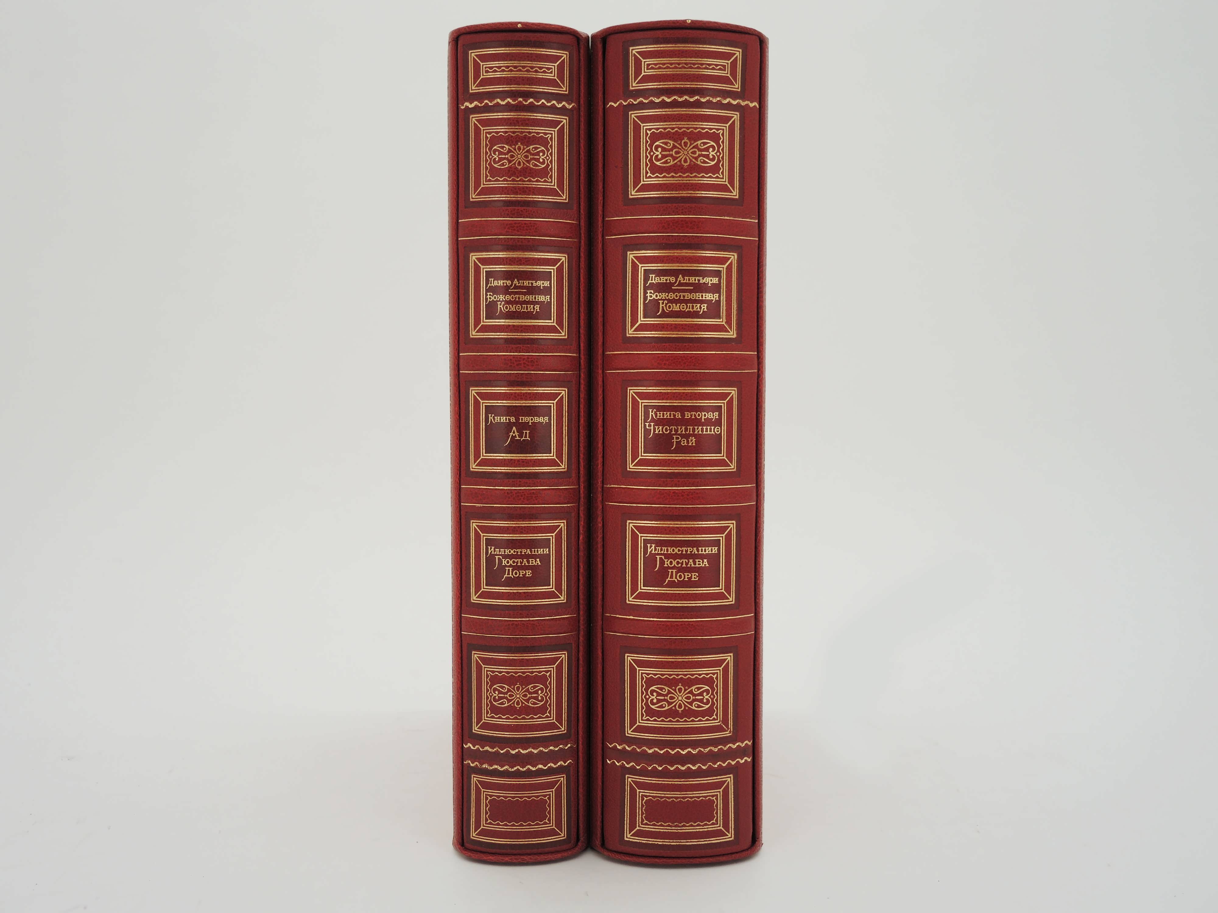 Одно из самых лучших роскошных дореволюционных иллюстрированных антикварных изданий. Именно в этом великолепном подарочном издании `Божественной комедии` великого итальянского поэта и мыслителя Данте Алигьери (1265-1321) впервые был воспроизведен полный цикл рисунков знаменитого художника Густава Доре. Гравюры на дереве выполняли лучшие мастера-графики Европы третьей четверти XIX века - Р. Паннемакер, Ж. Гошар, Л. Дюмон, Пизан, П. Вердейль, Т. Монвуазан и многие другие. Впервые `Божественная комедия` Данте с великолепными иллюстрациями Поля Гюстава Доре (1832-1883), вышла в Париже в конце 1860-х годов. До этого времени не существовало еще ни одного полного русского перевода знаменитого произведения Данте. Известный издатель, книготорговец и типограф польского происхождения, основатель петербургской книгоиздательской и книготорговой фирмы `Товарищество М. О. Вольфа`, ставший, по мнению современников, `первым русским книжным миллионером` Маврикий Осипович Вольф (1825-1883) решил выпустить русское издание `Божественной комедии) с теми же иллюстрациями, которые вошли в парижское издание. Вольф купил право публикации рисунков Дорэ и заказал перевод `Комедии` популярному в шестидесятые годы XIX века поэту Дмитрию Дмитриевичу Минаеву (1835-1889). В издании Вольфа все рисунки Дорэ были отпечатаны в технике торцовой гравюры на дереве, в которой работал французский художник, и воспроизведены в книге высокой печатью на отдельных листах. В предисловии издатель пишет: `Его Императорскому Высочеству Государю Наследнику Цесаревичу Великому Князю Александру Александровичу всепреданнейше посвящает издатель Маврикий Вольф`. Для `Божественной комедии` Данте М. О. Вольф выбрал стильную слоновую бумагу светло-бежевого цвета, плотную и гладкую, специально был заказан роскошный цельнокожаный переплет и использован тройной золотой обрез. В начале каждой песни помещен гравированный инициал (буквица). Данте Алигьери (1265-1321) по праву входит в ряд ведущих деятелей искусства своего времени. Вершиной его творчества стала `Комедия`, названная Боккаччо `Божественной`. Данте Алигьери писал свою поэму четырнадцать лет. В итоге `Божественная Комедия` на все времена прославила его имя, став жемчужиной мировой литературы. Луи-Кристоф-Поль-Густав Доре (Dore) (1832-1883) - знаменитый французский рисовальщик, живописец, скульптор и гравер, крупнейший иллюстратор XIX века. Всемирную славу принесло ему иллюстрирование Ветхого и Нового Завета, книг: `Гаргантюа и Пантагрюэль` Рабле, `Дон Кихот` Сервантеса, `Божественная комедия` Данте, `Потерянный рай` Мильтона, `Неистовый Роланд` Ариосто и многих других. `Великий Доре` – так называют художника исследователи его творчества. Это одно из роскошнейших подарочных изданий второй половины XIX века, представляющее культурную ценность как памятник книжного и переплетного искусства. [Часть 1]. Ад. Лейпциг, Издане М.О.Вольфа, типография Бера и Германа, 1874. [6], 257 с.: 76 л. илл. [Часть 2]. Чистилище. СПб., типография М.О.Вольфа, 1876.