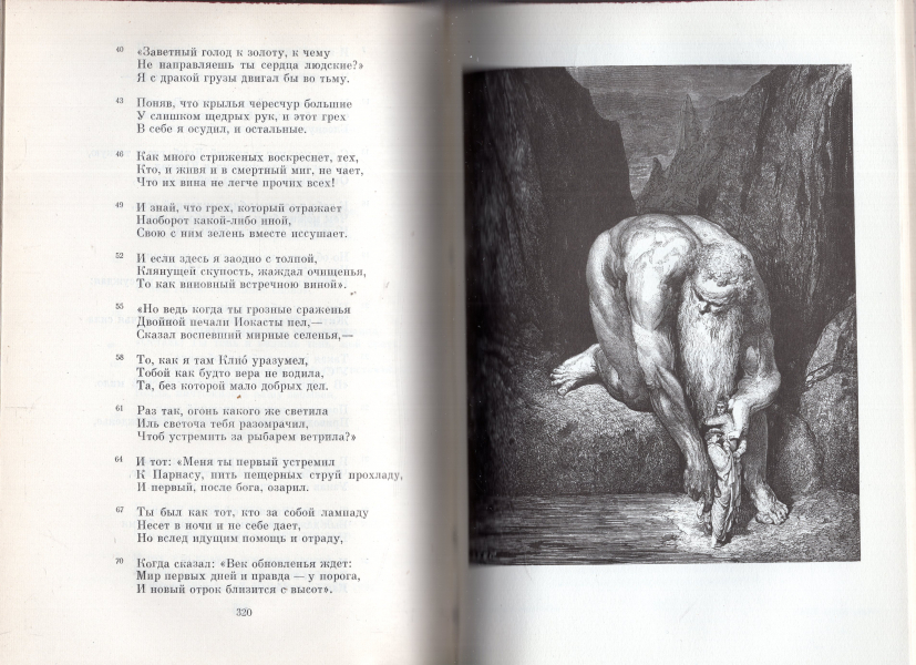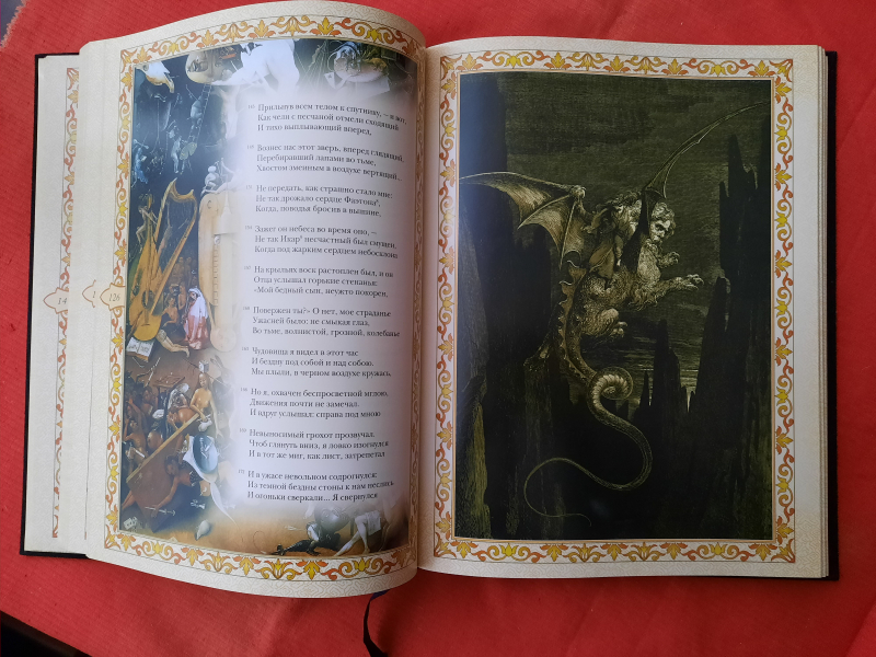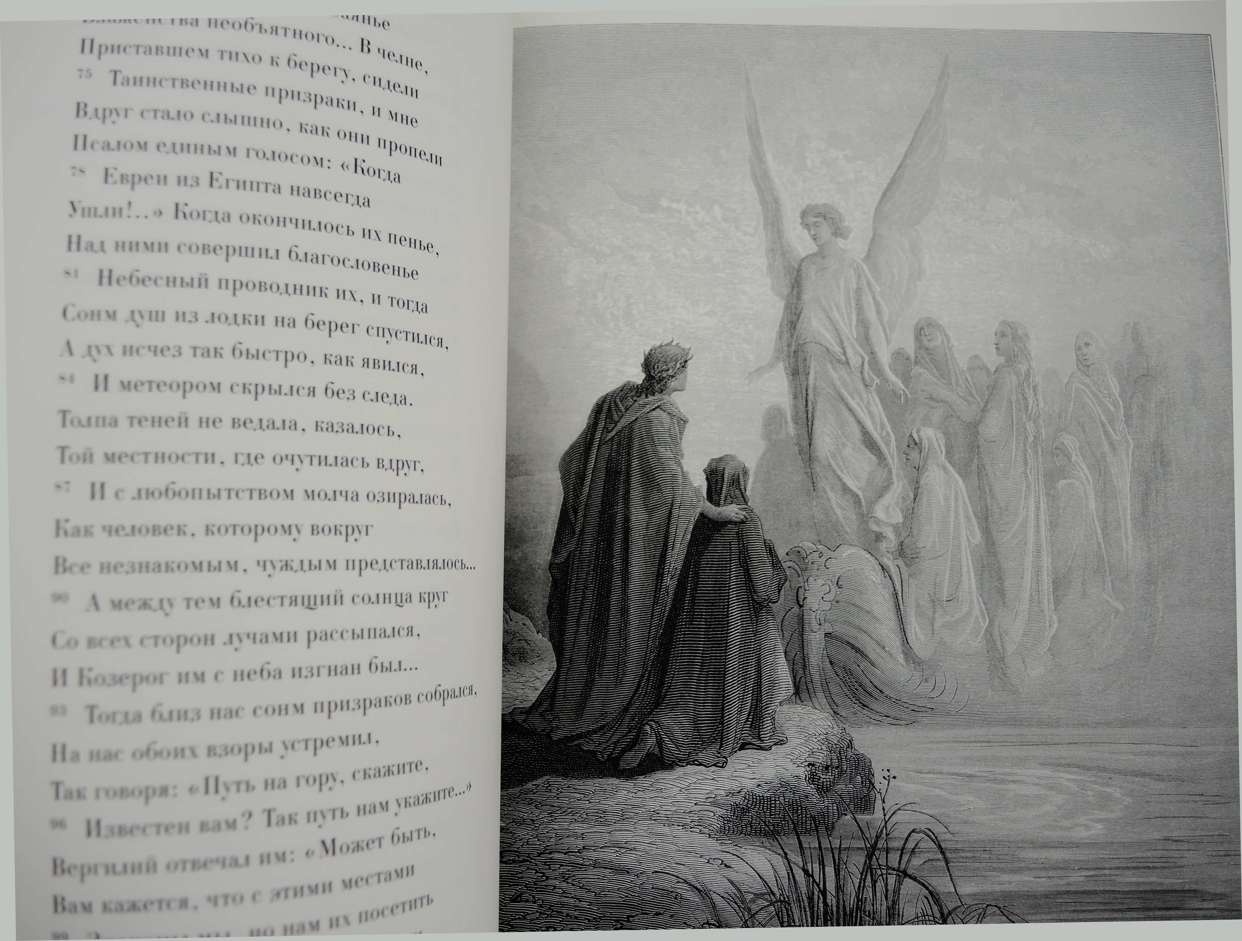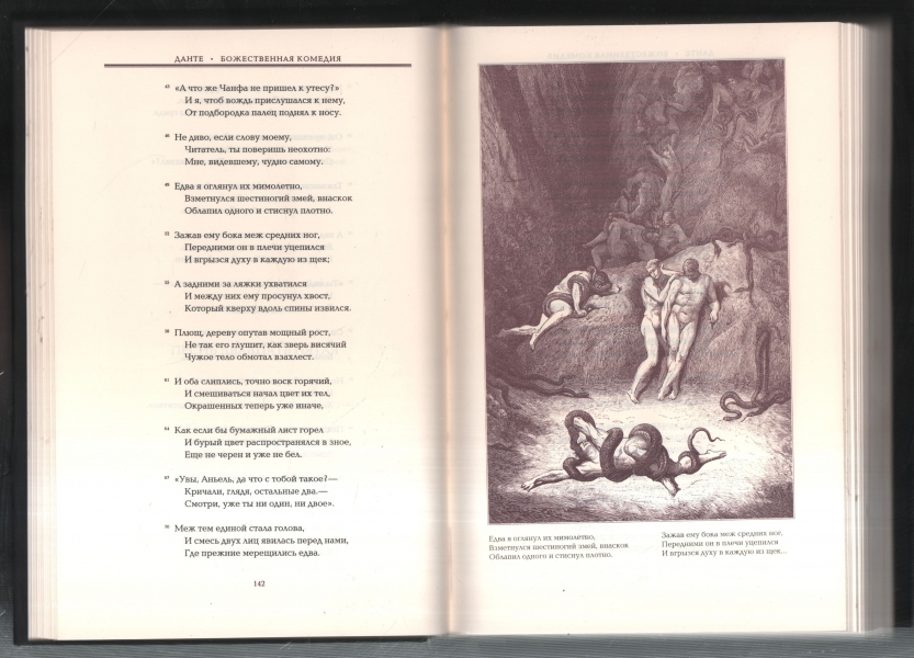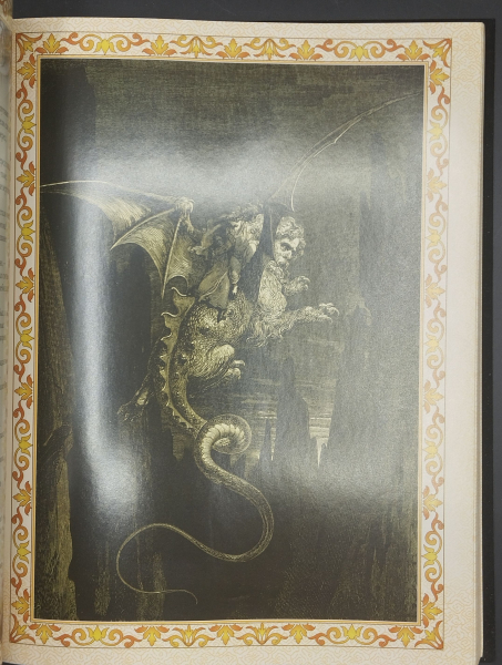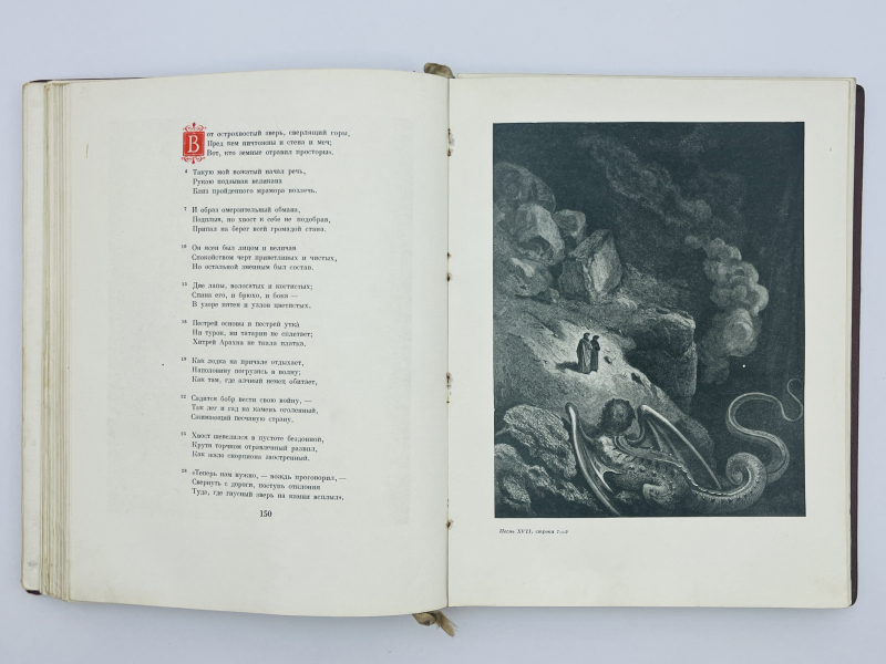 Одно из самых лучших роскошных дореволюционных иллюстрированных антикварных изданий. Именно в этом великолепном подарочном издании `Божественной комедии` великого итальянского поэта и мыслителя Данте Алигьери (1265-1321) впервые был воспроизведен полный цикл рисунков знаменитого художника Густава Доре. Гравюры на дереве выполняли лучшие мастера-графики Европы третьей четверти XIX века - Р. Паннемакер, Ж. Гошар, Л. Дюмон, Пизан, П. Вердейль, Т. Монвуазан и многие другие. Впервые `Божественная комедия` Данте с великолепными иллюстрациями Поля Гюстава Доре (1832-1883), вышла в Париже в конце 1860-х годов. До этого времени не существовало еще ни одного полного русского перевода знаменитого произведения Данте. Известный издатель, книготорговец и типограф польского происхождения, основатель петербургской книгоиздательской и книготорговой фирмы `Товарищество М. О. Вольфа`, ставший, по мнению современников, `первым русским книжным миллионером` Маврикий Осипович Вольф (1825-1883) решил выпустить русское издание `Божественной комедии) с теми же иллюстрациями, которые вошли в парижское издание. Вольф купил право публикации рисунков Дорэ и заказал перевод `Комедии` популярному в шестидесятые годы XIX века поэту Дмитрию Дмитриевичу Минаеву (1835-1889). В издании Вольфа все рисунки Дорэ были отпечатаны в технике торцовой гравюры на дереве, в которой работал французский художник, и воспроизведены в книге высокой печатью на отдельных листах. В предисловии издатель пишет: `Его Императорскому Высочеству Государю Наследнику Цесаревичу Великому Князю Александру Александровичу всепреданнейше посвящает издатель Маврикий Вольф`. Для `Божественной комедии` Данте М. О. Вольф выбрал стильную слоновую бумагу светло-бежевого цвета, плотную и гладкую, специально был заказан роскошный цельнокожаный переплет и использован тройной золотой обрез. В начале каждой песни помещен гравированный инициал (буквица). Данте Алигьери (1265-1321) по праву входит в ряд ведущих деятелей искусства своего времени. Вершиной его творчества стала `Комедия`, названная Боккаччо `Божественной`. Данте Алигьери писал свою поэму четырнадцать лет. В итоге `Божественная Комедия` на все времена прославила его имя, став жемчужиной мировой литературы. Луи-Кристоф-Поль-Густав Доре (Dore) (1832-1883) - знаменитый французский рисовальщик, живописец, скульптор и гравер, крупнейший иллюстратор XIX века. Всемирную славу принесло ему иллюстрирование Ветхого и Нового Завета, книг: `Гаргантюа и Пантагрюэль` Рабле, `Дон Кихот` Сервантеса, `Божественная комедия` Данте, `Потерянный рай` Мильтона, `Неистовый Роланд` Ариосто и многих других. `Великий Доре` – так называют художника исследователи его творчества. Это одно из роскошнейших подарочных изданий второй половины XIX века, представляющее культурную ценность как памятник книжного и переплетного искусства. [Часть 1]. Ад. Лейпциг, Издане М.О.Вольфа, типография Бера и Германа, 1874. [6], 257 с.: 76 л. илл. [Часть 2]. Чистилище. СПб., типография М.О.Вольфа, 1876.