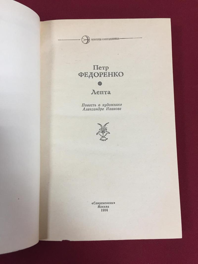 Тираж 50000. Книга рассказывает о жизни гениального русского художника Александра Иванова, автора всемирно известной картины *Явление Христа народу*. Используя интересный, малоизвестный широкому читателю фактический материал, П. Федоренко воспроизводит события политической, культурной жизни России первой половины XIX столетия. В книге мы встречаем таких деятелей русской культуры, как Брюллов, Гоголь, Тургенев, Герцен, оказавших свое влияние на творчество Александра Иванова.