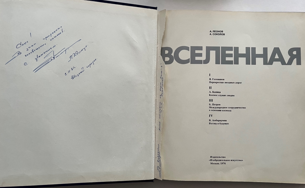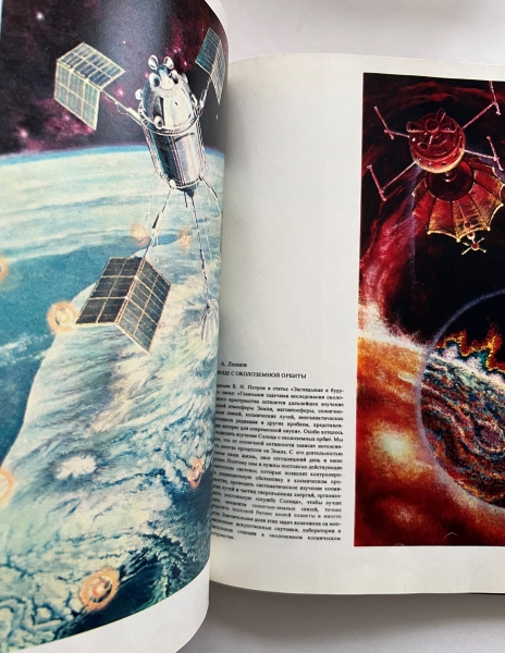 Первое, подарочное издание данной книги. Общий тираж 5000 экземпляров. Однако 1000 штук были изготовлены как подарочные на мелованной бумаге, с объемным макетом на обложке иллюминатора и также с 3-Д картинкой, изображающей Землю в иллюминаторе. 1.Я.Голованов.Перекрестки звездных дорог.2.А.Капица.Космос служит людям.3.Б.Петров.Международное сотрудничество в освоении космоса.4.В.Амбарцумян.Взгляд в будущее. В книге-альбоме наглядно показано, как выходил человек на просторы Вселенной, говорится о настоящем и будущем. Сейчас все больше художников пытаются отобразить в своих произведениях тему проникновения в космос человека. Но, пожалуй, мало кому из них удалось так близко подойти к космосу, как это сделали авторы публикуемых здесь рисунков. Секрет такой близости прост: автор части рисунков - космонавт Алексей Леонов, первый в мире человек, который вышел из космического корабля в открытый космос, сам стал на некоторое время спутником Земли. Его коллега - художник-фантаст Андрей Соколов, посвятивший свое творчество изображению космоса. Некоторые картины созданы совместно. Необыкновенные пейзажи, увиденные космонавтами и переданные в рисунках А. Леоновым, имеют не только познавательное, научное или эстетическое, но и глубокое философское значение. Они показывают, как необычайно многообразна и ярка природа, как расширяются наши представления о Вселенной по мере все большего проникновения в космос человека. В альбоме реальность и фантазия идут вместе, ведь без фантазии немыслимо движение вперед.