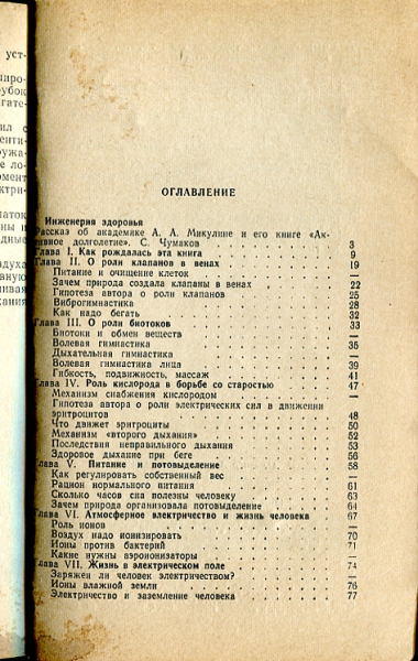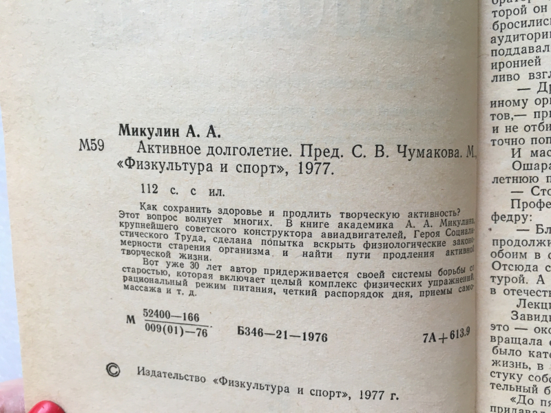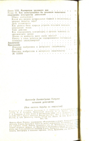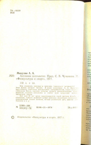 Как сохранить здоровье и продлить творческую активность? Этот вопрос волнует многих. В книге академика А.А. Микулина, крупнейшего советского конструктора авиадвигателей, Героя Социалистического Труда, сделана попытка вскрыть физиологические закономерности старения организма и найти пути продления активной творческой жизни. Вот уже 30 лет автор придерживается своей системы борьбы со старостью, которая включает целый комплекс физических упражнений, рациональный режим питания, четкий распорядок дня, приемы самомассажа и т.д. Печатается по изданию Микулин А.А. Активное долголетие., М., ФиС, 1977г.