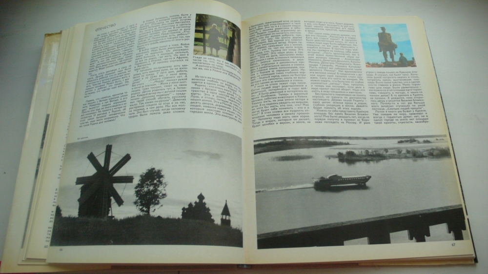 Превосходные очерки с многочисленными красочными фотоработами автора в формате фотоальбома, очень лиричный и необыкновенно талантливый рассказ о нашей стране, ее людях и природном мире. `Все, что собрано в этой книге, для меня представляется большим путешествием. В сущности, все так и есть. Пятнадцать лет я работаю в `Комсомольской правде`, пятнадцать лет летаю, езжу и хожу по земле. Я рассказал о том, что увидел, о том, что очень люблю, о том, что меня взволновало и удивило. Я бывал за рубежами нашей страны, но в эту книгу собрал что особенно дорого, что можно соединить словом Отечество. Никто не возьмется перечислить всего, что стоит за емким словом Отечество. Но все-таки можно сказать: понятие Родины - это память обо всем, что нам дорого в прошлом, это дела и люди нынешних дней, это родная земля со всем, что растет и дышит на ней. Старое, Новое, Вечное - таков символический ключ путешествия. К этому надо добавить: Родина наша сильна, велика и богата благодаря союзу многих народов, ее населяющих. Приезжая в Литву, Киргизию, Грузию, на Чукотку, в любой угол нашей страны, я чувствовал, что я дома, в своей семье. Имя нашему братству - Союз Советских... Мелованная бумага, вес 935г.