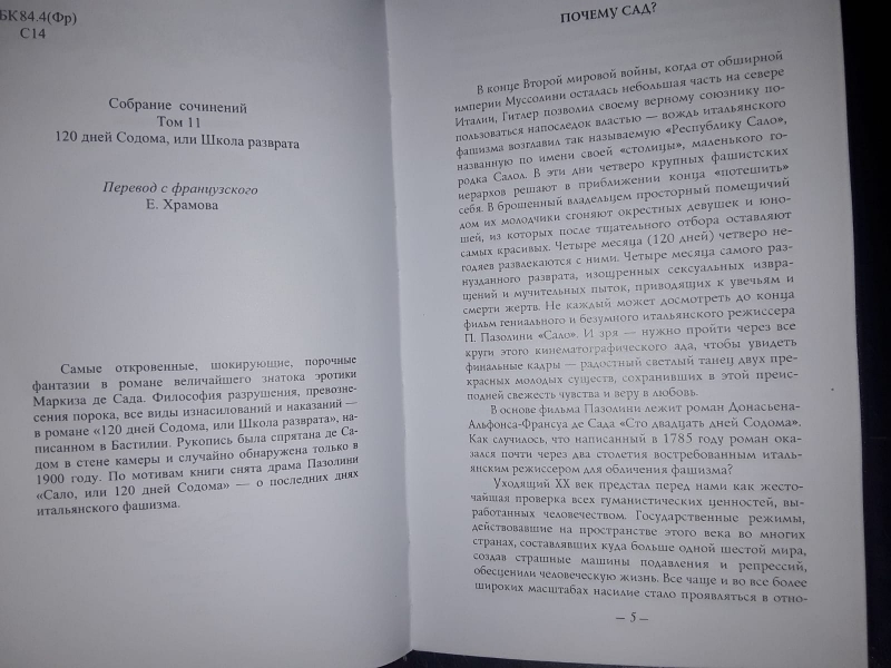 Донатьен-Альфонс-Франсуа де Сад (маркиз де Сад) принадлежит к писателям, называемым `проклятыми`. Трагичны и достойны самостоятельных романов судьбы его произведений. Судьба самого известного произведения писателя `Сто двадцать дней Содома` была неизвестной. Ныне роман стоит в таком хрестоматийном ряду, как `Сатирикон`, `Золотой осел`, `Декамерон`, `Опасные связи`, `Тропик Рака`, `Крылья`… Лишь, в год двухсотлетнего юбилея маркиза де Сада его творчество было признано национальным достоянием Франции, а лучшие его романы вышли в самой престижной французской серии `Библиотека Плеяды`. Перед Вами – текст первого издания романа маркиза де Сада на русском языке, опубликованного без купюр.