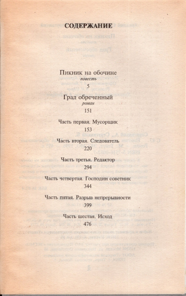 «Пикник на обочине» — философская фантастическая повесть братьев Стругацких, впервые изданная в 1972 году. Повесть лидирует среди прочих произведений авторов по количеству переводов на иностранные языки и изданиям за пределами бывшего СССР. По состоянию на 2003 год, Борис Стругацкий насчитал 55 изданий «Пикника» в 22 странах. По мотивам повести режиссер Андрей Тарковский в 1979 году снял фильм «Сталкер», братья Стругацкие выступили авторами сценария. На английском языке повесть опубликована в переводе Антонины Буис. Предисловие к первому американскому изданию (MacMillan Publishing Co., Inc, New York, 1977) написал Теодор Старджон. Послесловие к немецкому изданию 1977 года написал Станислав Лем, который высоко оценил это произведение. Термин «сталкер» (от англ. to stalk — «идти крадучись») устойчиво вошел в русский язык и, по признанию авторов, стал самым популярным из созданных ими неологизмов. В контексте книги сталкер — это человек, который, нарушая запреты, проникает в Зону и выносит из нее различные артефакты, которые впоследствии обычно продает и тем самым зарабатывает на жизнь. В русском языке после фильма Тарковского этот термин приобрел смысл проводника, ориентирующегося в различных запретных и малоизвестных другим местах и территориях. Позднее сталкерами также стали называть любителей индустриального туризма, особенно посещающих заброшенные объекты и города-призраки. «Пикник на обочине» не удавалось выпустить книжным изданием в Советском Союзе на протяжении восьми лет — первый договор на издание его в составе сборника был заключен авторами с издательством «Молодая гвардия» в 1972 году, готовая рукопись была одобрена и прошла первую редактуру в 1973 году, однако из-за последующих многочисленных проволочек и откровенного саботажа нового состава редакции сборник под названием «Неназначенные встречи» вышел только в 1980 году в измененном составе и с многочисленными исправлениями в тексте «Пикника». Полностью восстановленный и наиболее близкий к авторскому замыслу текст вышел в полном собрании сочинений, выпущенном московским издательством «Текст» в 1991 — так называемое «белое» издание, — в томе седьмом: в книжной серии «Миры братьев Стругацких» (1997): а также включен (с некоторыми исправлениями) в так называемое «черное» собрание сочинений Стругацких, выпускавшееся в 2000—2003 годах. Этот текст используется во всех последующих изданиях последних лет. «Град обреченный» — философский роман (часто называемый антиутопией), писался «в стол», когда братья оказались в состоянии мировоззренческого кризиса, а затем оказались ограничены в возможностях публиковаться. Авторам было важнее всего показать, как происходит перелом в психологии, как происходит перелом в мировоззрении человека, который начинает как верующий раб, потом теряет веру, теряет бога, теряет хозяина и остается в безвоздушном пространстве, без опоры под ногами. И выясняется, что без мировоззренческой опоры жить чудовищно трудно. Тираж: 20 000 экз. Вес без упаковки 380 г.