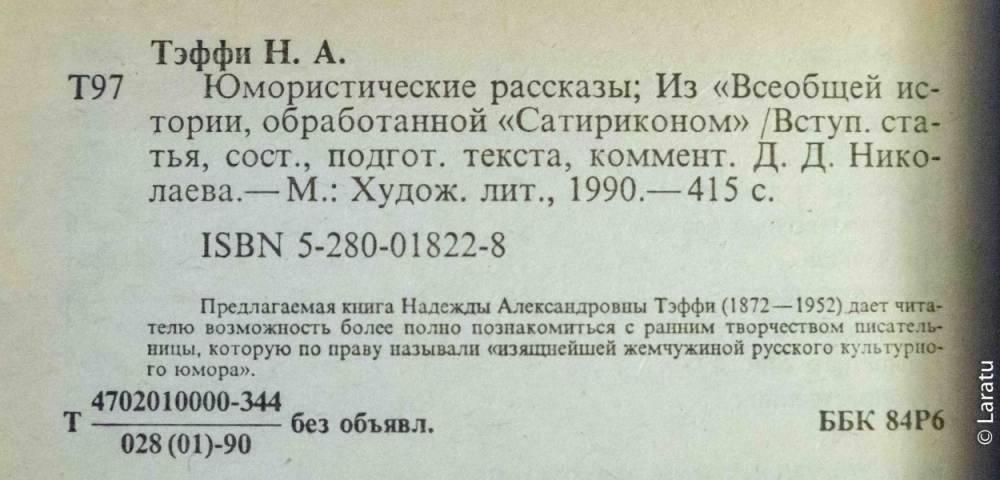 | 39 | BS-Laratu Москва. М. Художественная литература 1990г. 415 с. Мягкий переплет, Обычный формат. Состояние: Хорошее Обложка – Разворот – БиблиографическаяКарточка |