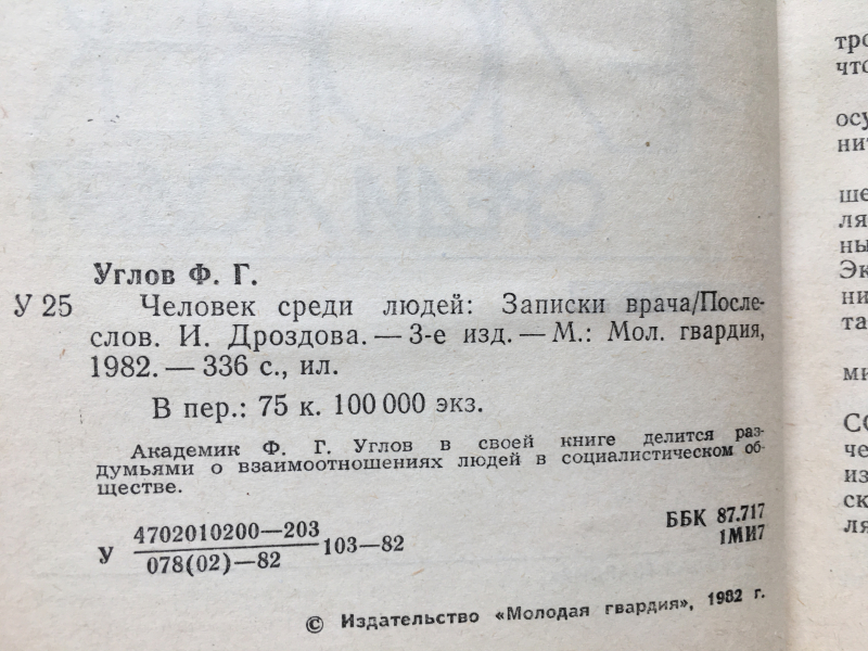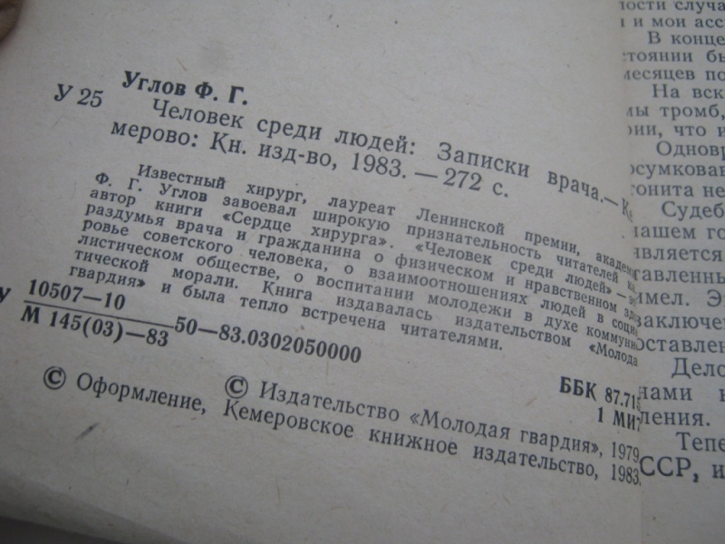 Книга знаменитого врача, хирурга, доктора медицинских наук, академика, сибиряка, родом с берегов реки Лены в Иркутской губернии, Федора Григорьевича Углова (1904 – 2008). Он прожил 103 года, до последних дней сохраняя ясность ума и физическую активность, доказав своей жизнью эффективность разработанной им системы здорового образа жизни. В книге `Будни хирурга`, которая выходила в СССР под названием `Человек среди людей`, Ф. Углов рассказывает о своей жизни, о своей работе, о методах ождоровления и приемах излечения. Главные герои книги Федора Григорьевича — его пациенты. В каждой строчке чувствуется то, как важна для него каждая человеческая жизнь, как упорно, иногда почти без надежды на успех сражается он со смертью и побеждает ее. Тираж 4 000 экз.